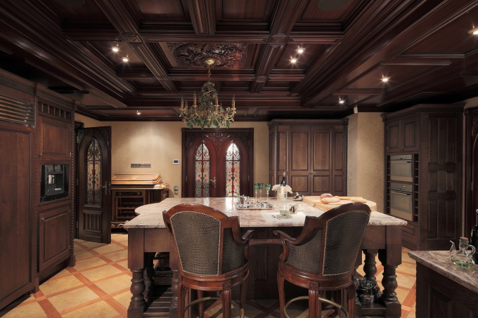 Обычно дизайн винотеки в дворцовом стиле предусматривает наличие в интерьере данного помещения сложных рисунков мебельной обивки. Здесь используются добротные тканые гобелены, искусная и незаурядная деревянная резьба, изящные и элегантные литые подсвечники, статуэтки, грациозные вазы, пышные люстры из хрусталя. Благодаря этому обстановка делается еще более роскошной и незаурядной.