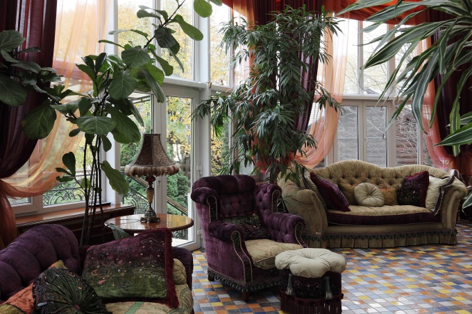 Чтобы превратить традиционный зеленый уголок в комфортабельное место для отдыха, дизайнеры предлагают использовать мягкие детали обстановки. Если, к примеру, зимний сад во фьюжн стиле предполагает применение мебели вычурных форм и расцветок, то представленный вариант, выполненный в неоклассике, диктует использование диванов и кресел классических форм с обивкой из текстиля насыщенных либо же пастельных тонов. Дополняются подобные интерьеры также столиками из древесины, пуфами, настольными или напольными лампами и, конечно, обилием декоративных растений, которые превращают зону отдыха в домашний оазис.
