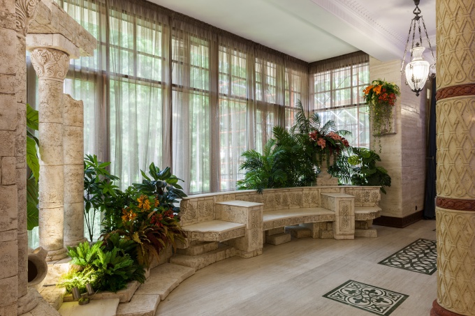 Интерьеры отведенного для отдыха и релакса здания должны были быть респектабельными, эффектными и способными удивлять. Поэтому архитектор выбрал путь эклектики, сложного сочетания разных стилей и направлений. Но ключевую роль в его многоплановом облике играют элементы романского стиля и готики.