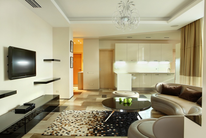 Небольшая московская квартира, выполненная в современной стилистике, предназначена для проживания небольшой молодой семьи, состоящей из двух человек. Решенная в светлых тонах, она представляет собой функциональное пространство, поделенное на две зоны: общую, куда вошли гостиная с зоной кухни и столовая - они разделены симметрично расположенными стеллажами, и частную, где расположились спальня с санузлом.