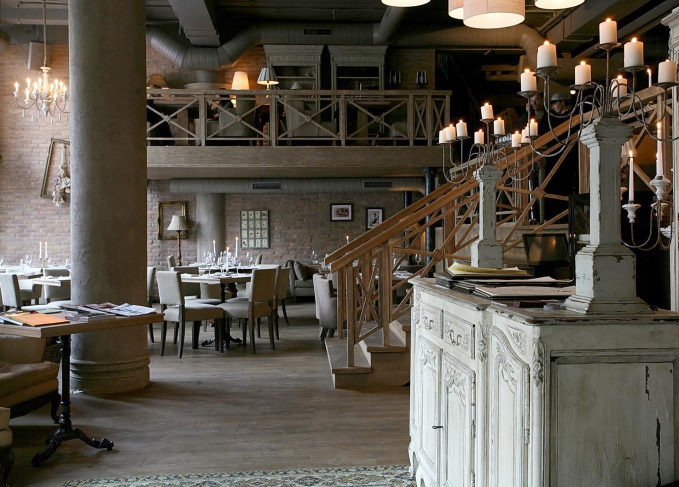 ДальшеСемейный ресторан BlackBerry выполнен в стилистике французского Прованса. Несмотря на то, что расположен он в офисном центре, по настроению он напоминает скорее большой и уютный дом. На создание домашней атмосферы работают предметы из выбеленного дерева: лестница, дубовый состаренный пол, деревянные столы и стулья, старинные комоды и шкафы, купленные на блошиных рынках Франции. А также мягкая мебель (стулья, кресла, диваны) обтянутая натуральными тканями бежевого цвета, она выполнена на заказ по эскизам архитектора на российском производстве BENI.