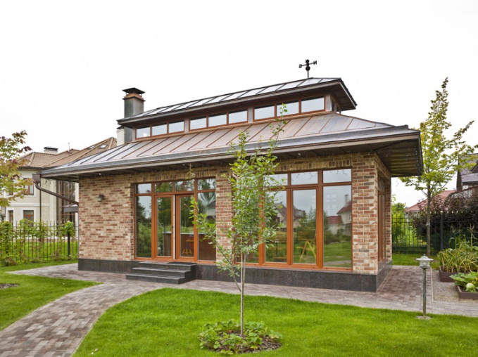 Работая над проектом двухэтажного дома в американском стиле, архитекторы Николай Цупиков и Линда Хаджо спроектировали на участке небольшую беседку в духе французской оранжереи с панорамными деревянными окнами и медной ступенчатой кровлей. Центральное место в беседке занимает мини-кухня с печью и барбекю из светлого кирпича в стиле шале. Аутентичный вид ей придают мангал и заслонки из черненого металла. По обе стороны от очага расположены навесные и нижние кухонные шкафы, поверхности для приготовления пищи, а также раковина с винтажным бронзовым краном.