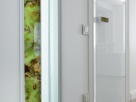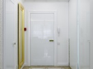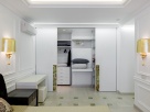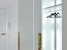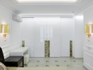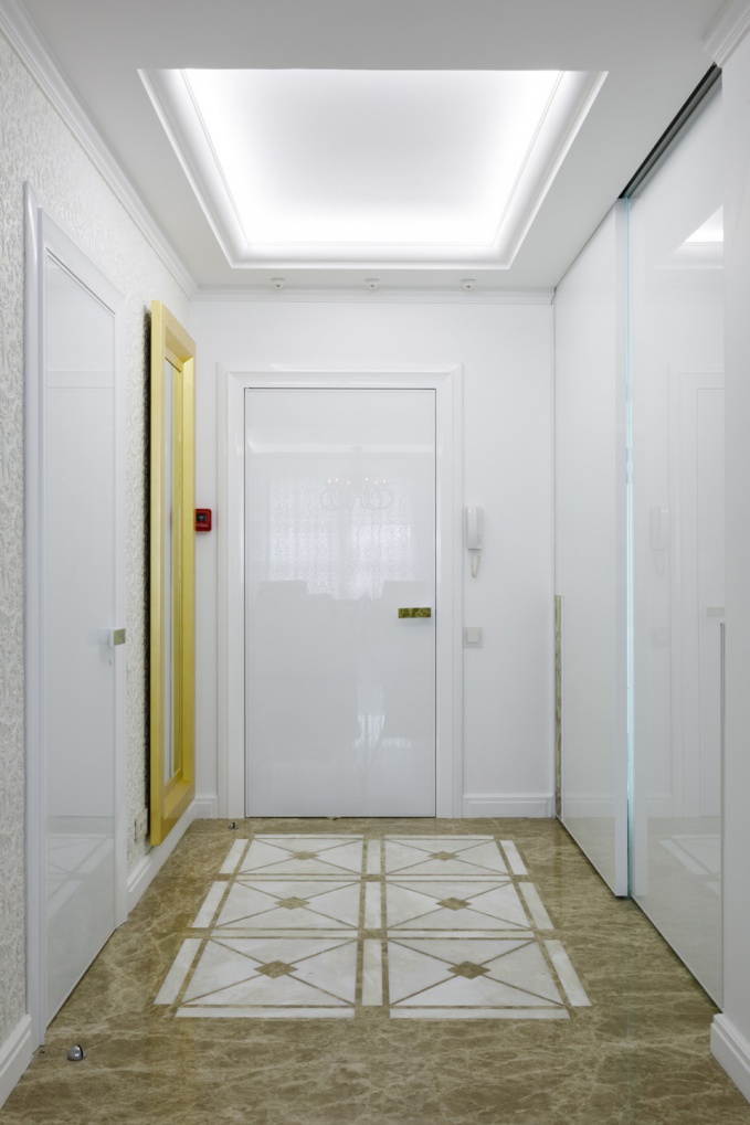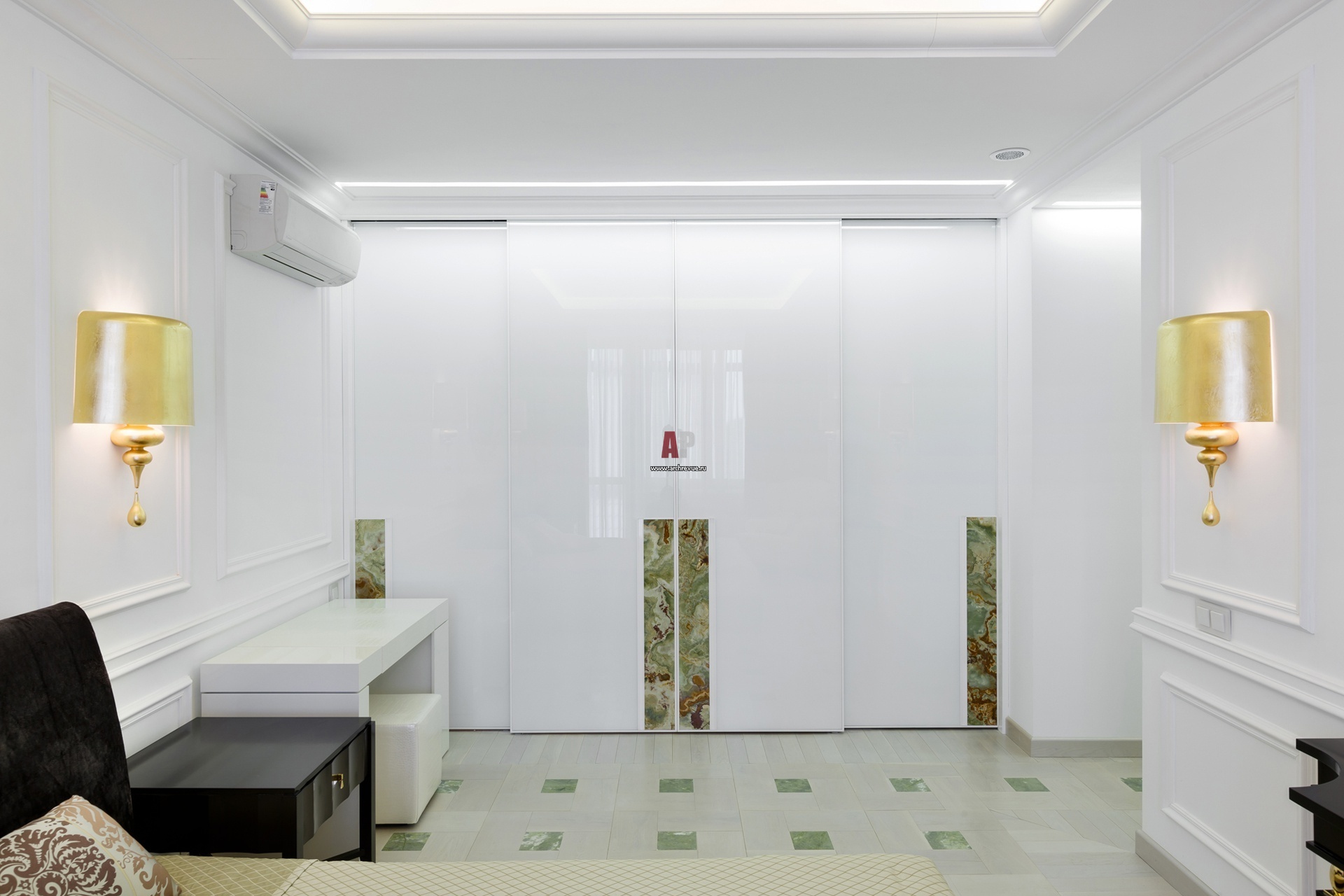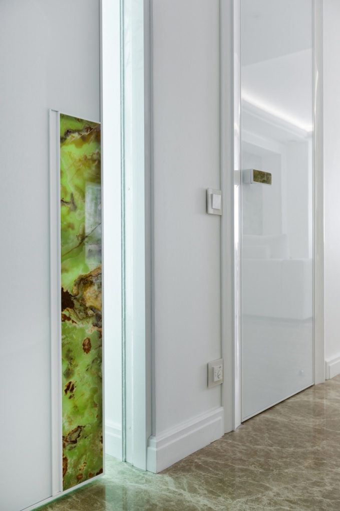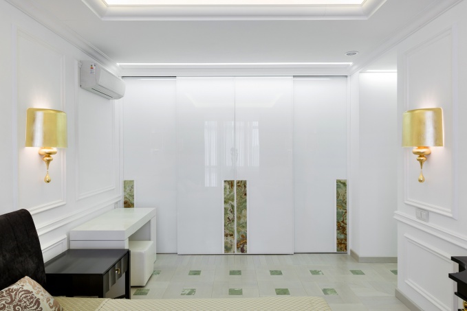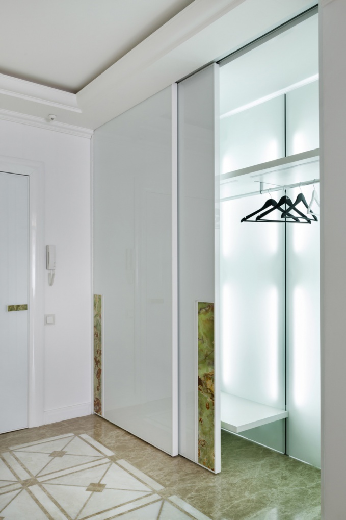 Работая над дизайн-проектом интерьера квартиры для временного проживания семьи с двумя детьми, команда архитекторов под руководством дизайнера Ольги Кулекиной стремились создать функциональный интерьер, который отвечает требованиям сегодняшнего дня. Именно поэтому при разработке плана квартиры они предусмотрели отдельную большую гардеробную комнату (при входе) и два встроенных шкафа (в прихожей и спальне). Шкафы-купе гардеробных и дверь в большую гардеробную оформлены в соответствии с общей концепцией. Белые глянцевые минималистичные фасады украшены вставками из зеленого оникса.