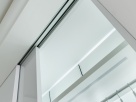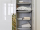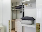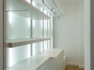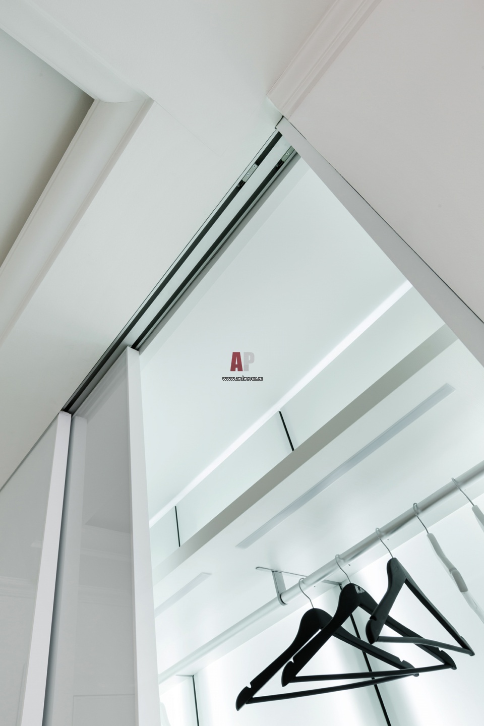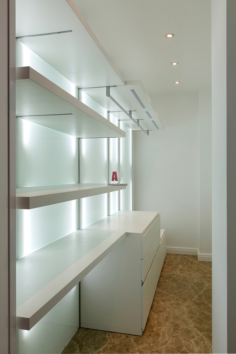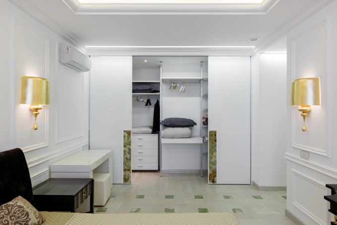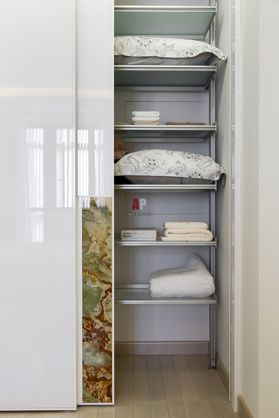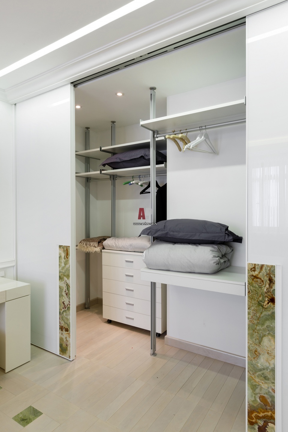 Для гардеробной системы, которая скорее напоминает маленькую полноценную гардеробную комнату, в спальне были заказаны эффектные раздвижные перегородки из белого стекла с большими плоскими ручками из натурального оникса, коллекция Janus. фабрика Longhi (Италия). Фасад шкафа-купе набран из четырех частей, которые открываются автономно. Внутри оборудованы секции для хранения постельных принадлежностей, вешала для одежды и тумбы для мелких предметов. Полки крепятся на металлических кронштейнах.