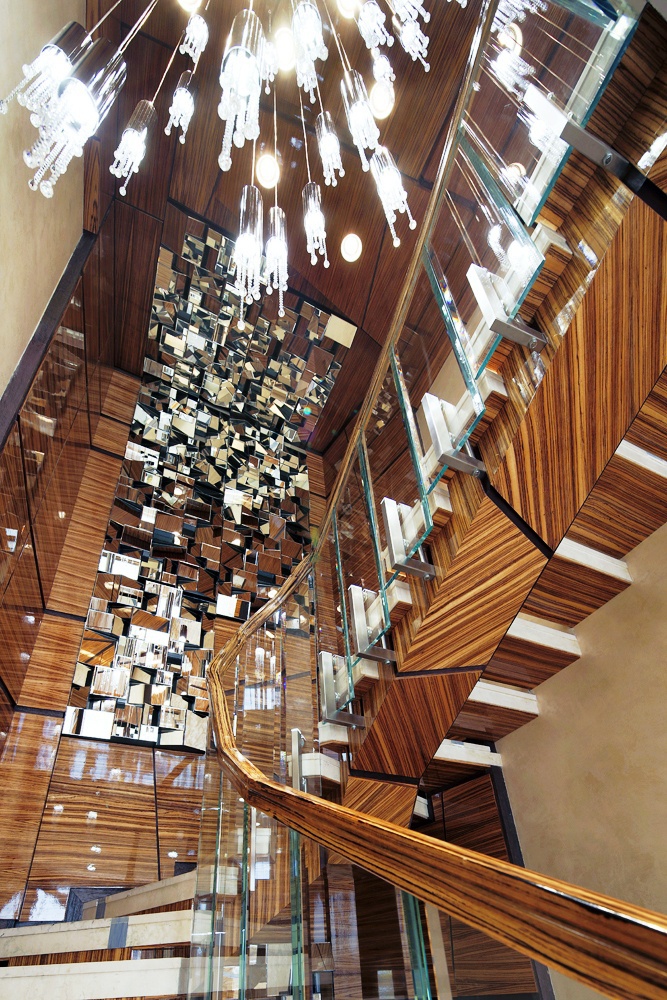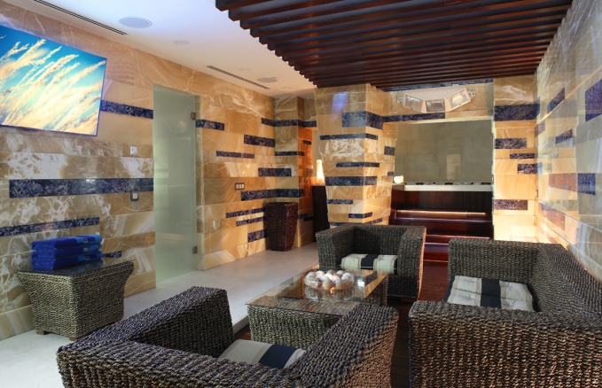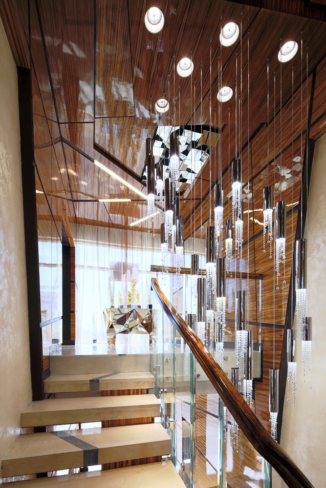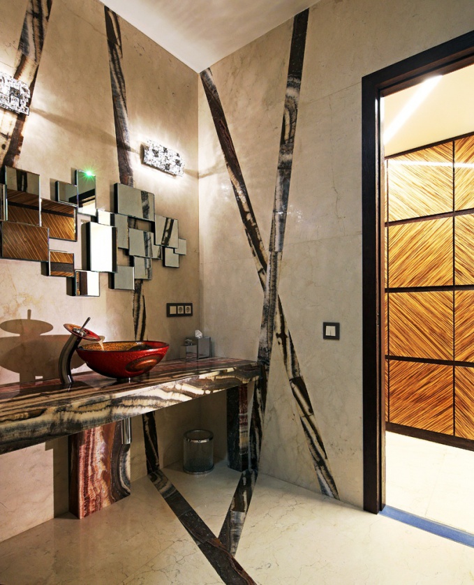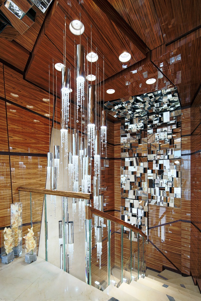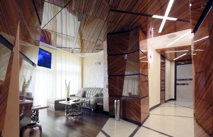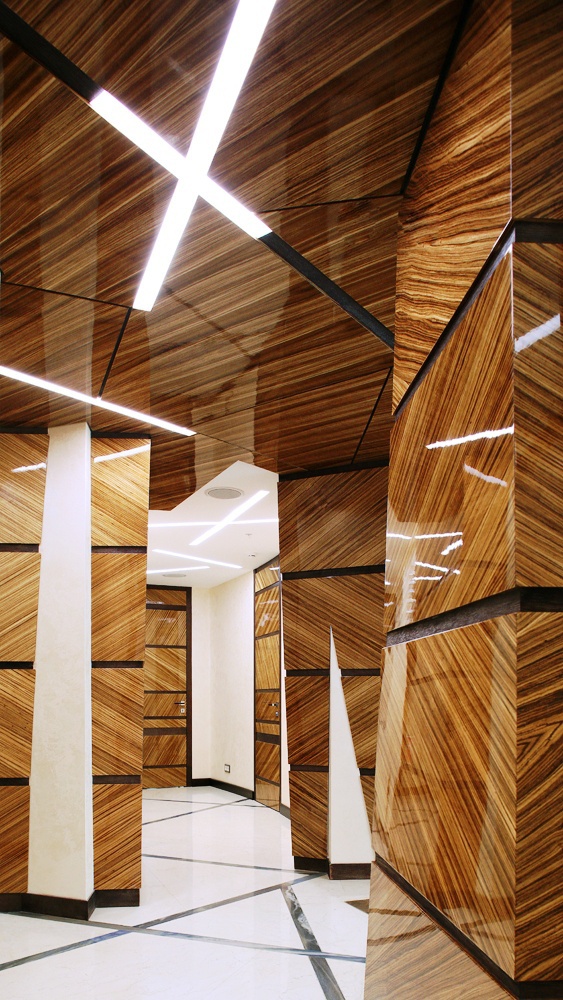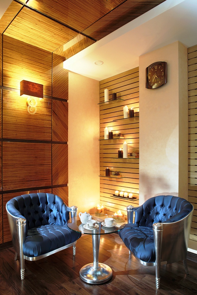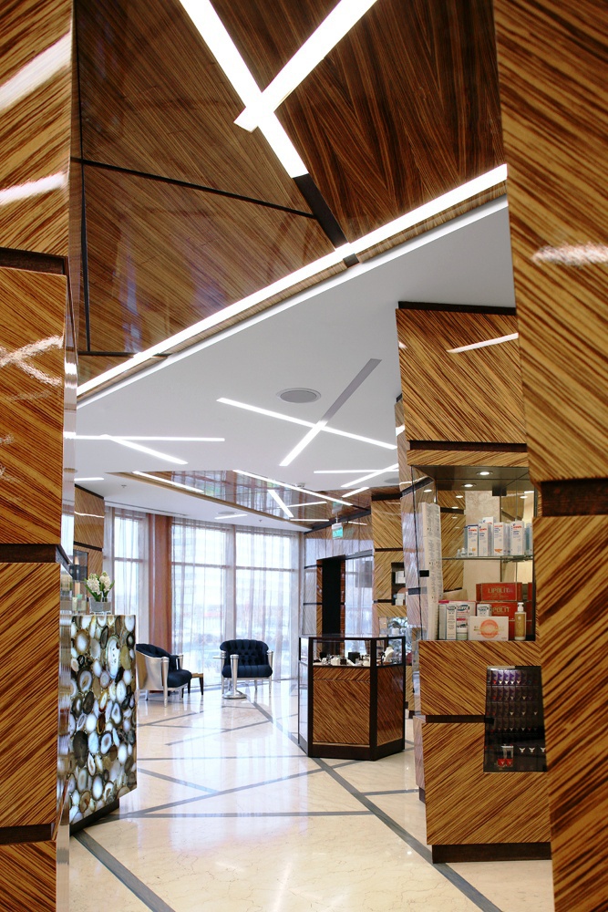 Фантастические архитектурные формы создают сильное впечатление у посетителей Спа-салона буквально с порога. Спа-салон находится в новом ЖК " Дирижабль ", овальной формы, площадью 520 квм. Неожидаешь увидеть эти вертикально расположенные деревянные панели, отделанные шпоном зебрано с хаотичными рустами выполненные из ореха, которые переходят со стен на потолок и придают динамичность и графичность. Стойка ресепшен, выполненная из натурального полудрагоценного камня, агата синего цвета. Светлый мрамор на полу с хаотичные на первый взгляд полосками из голубого гранита, которые повторяются на потолке в виде светильников, как отражение. И эта тема проходит по всему салону.