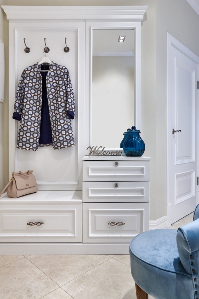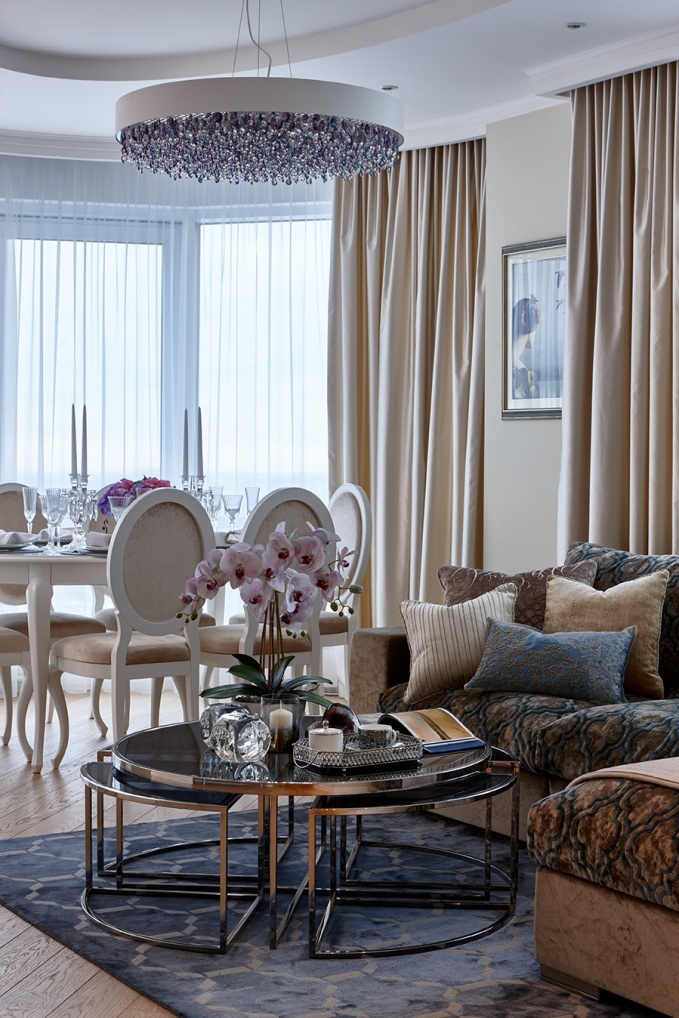 Для молодой девушки дизайнер Виктория Смирнова оформила квартиру в современном жилом комплексе, создав светлый и романтичный интерьер для жизни и отдыха. В качестве основной стилистики была выбрана современная классика, максимально облегченная, нежная и воздушная. Квартира площадью 80 кв. м была приобретена заказчицей с готовым ремонтом. Полы из темного дерева, массивные темные двери, теплые охристые стены, терракотовая керамика – таков был изначальный интерьер. Дизайнер Виктория Смирнова его полностью изменила, сохранив планировочную схему. «Особенность двухкомнатной квартиры состоит в том, что в ней всего одно окно – в зоне гостиной-кухни. В спальню дневной свет попадает через витражи из матового стекла, установленные между помещениями.