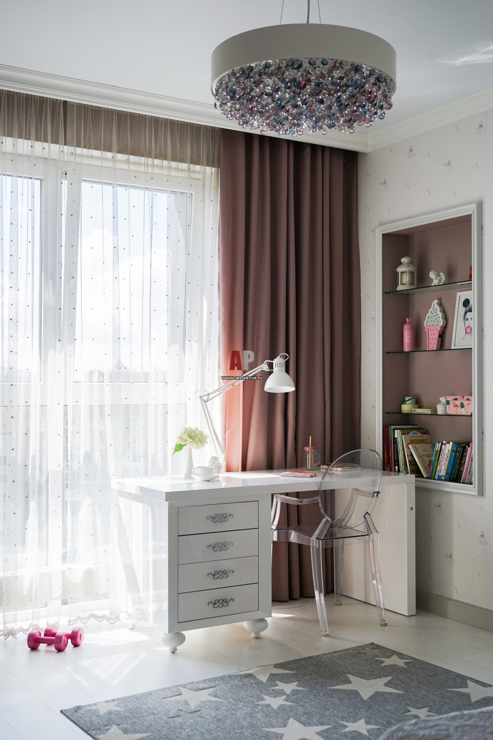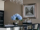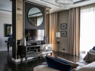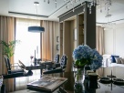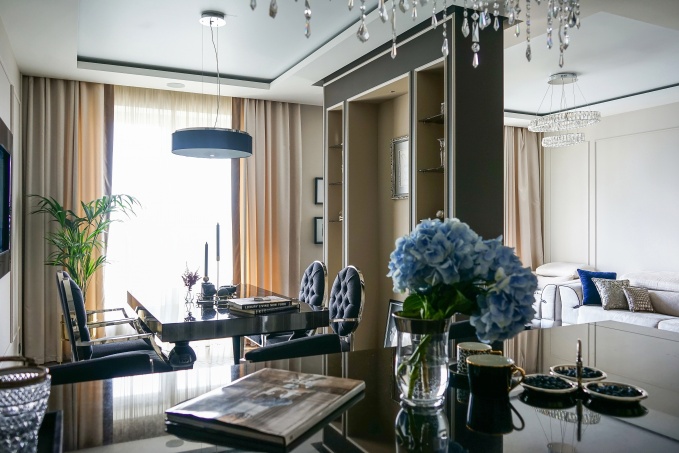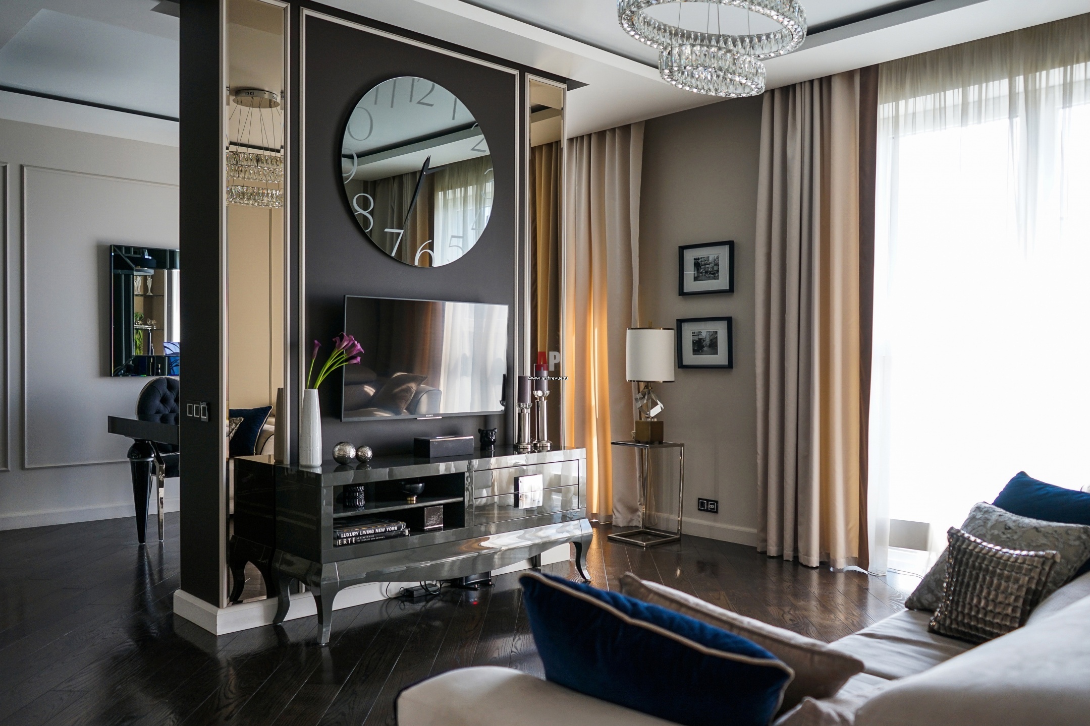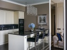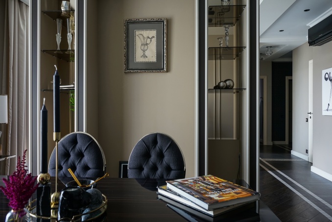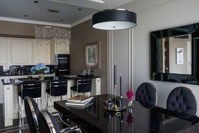 Заказчики дизайнера Ольги Айсиной – молодая семейная пара с ребенком – любят светскую жизнь, встречи с друзьями и вечеринки. Им близок стиль парижских салонов и изысканная атмосфера в стиле ар-деко. В квартире площадью 98 кв. м они хотели создать удобную и эффектную зону для приемов и приятного времяпрепровождения. Дизайнер разделила общую гостиную темной перегородкой с фацетными зеркалами зеркальными часами, с одной стороны она разместила мягкую группу с бежевым диваном, с другой – обеденный стол. В одном пространстве с гостиной находится кухня с островом. Благодаря классическому дизайну и эффектной отделке итальянский гарнитур воспринимается продолжением интерьера парадной зоны.