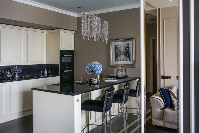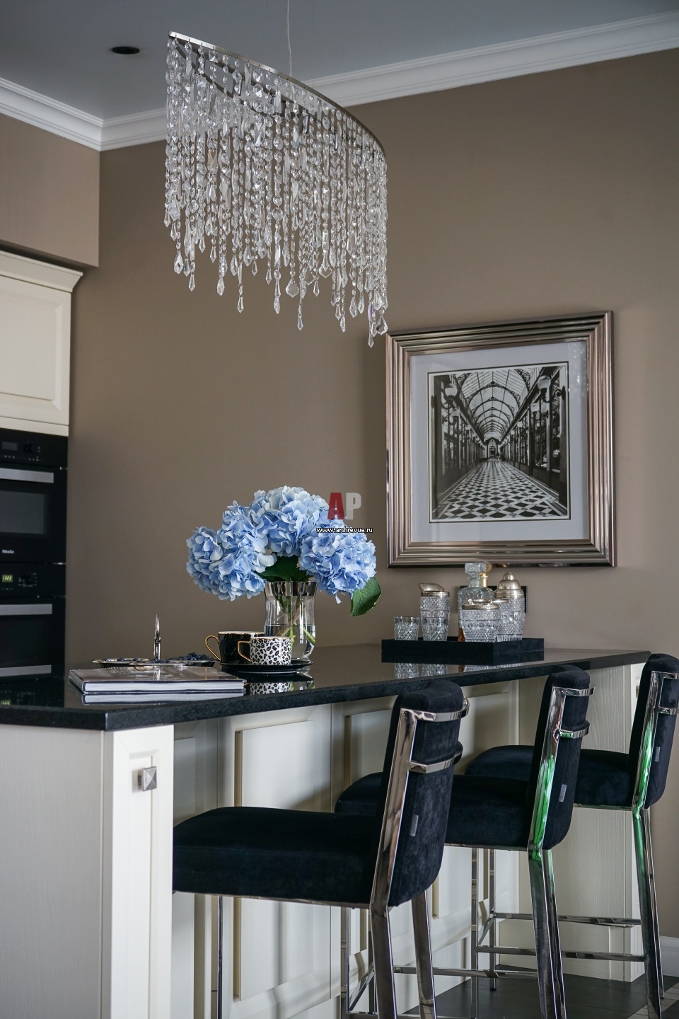 Остров имеет вытянутую форму, его столешница длиной 2,5 метра выполнена из черного камня. Вместе с украшенными хрустальными подвесами светильником она выглядит необычайно стильно.