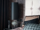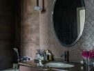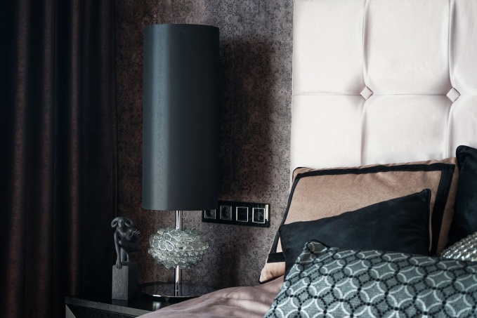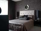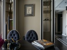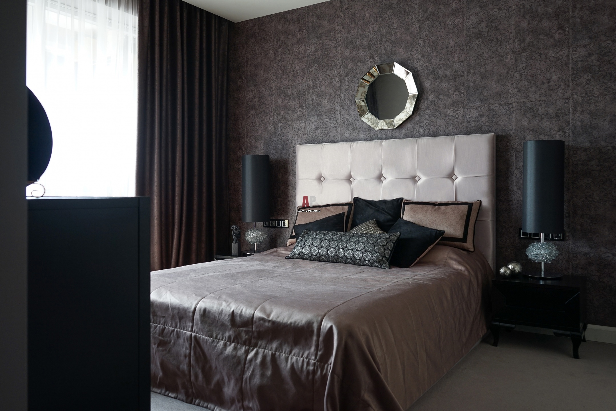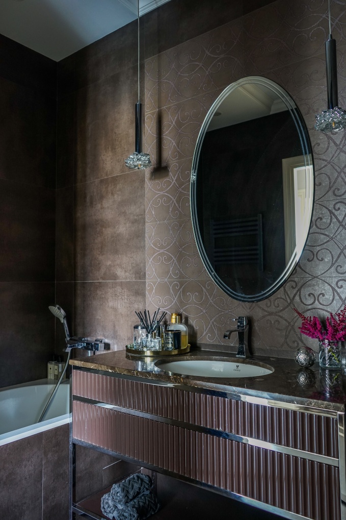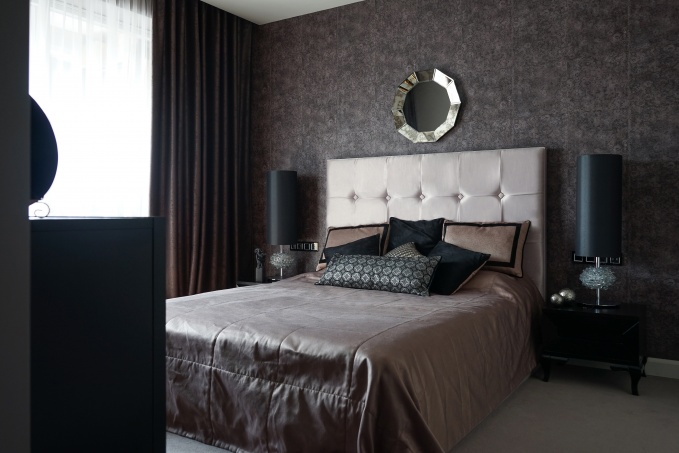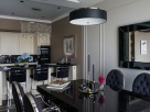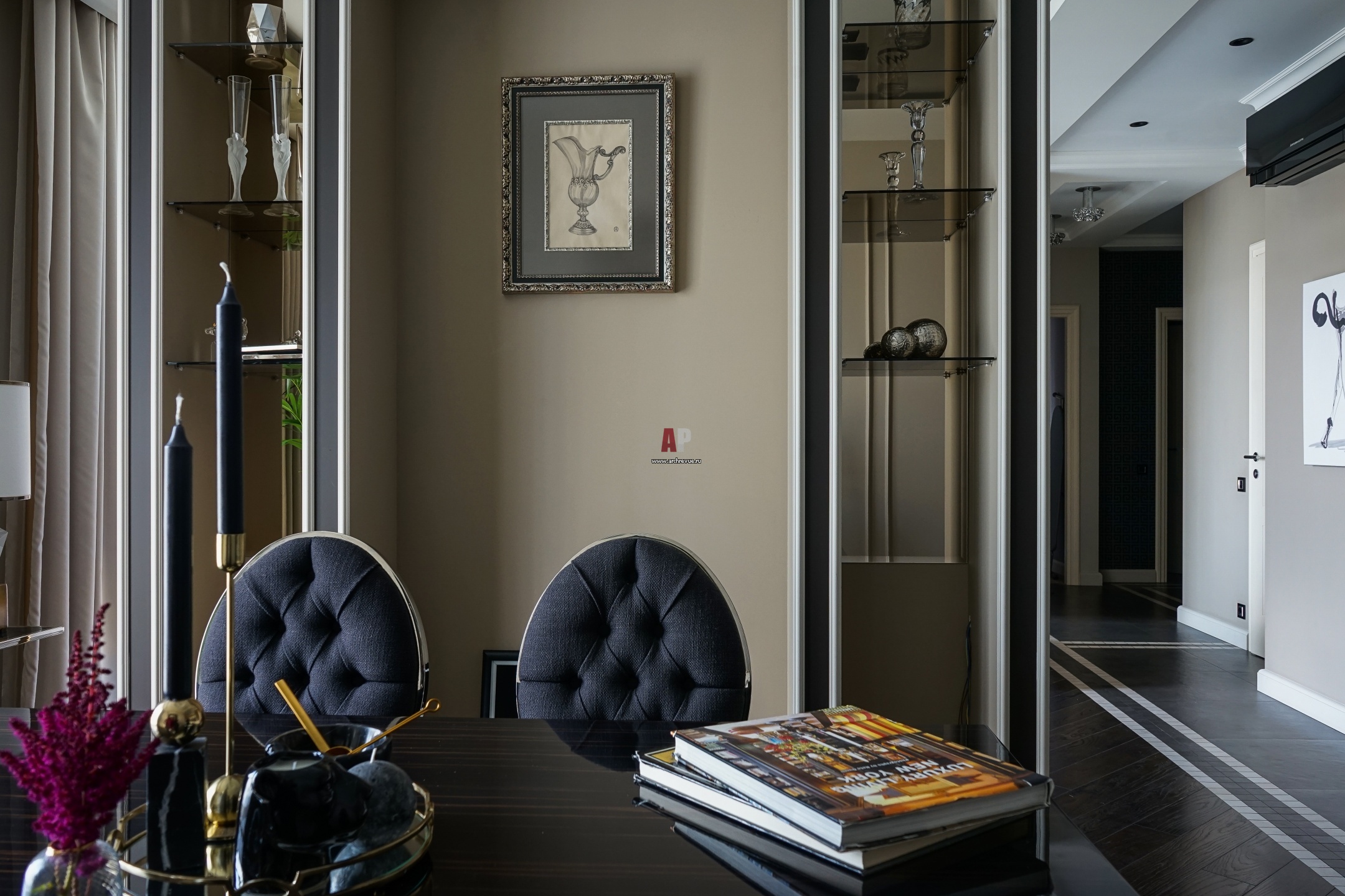 В интерьере ставка сделана на благородную темную гамму с оттенками кофе, сливок и шоколада. Лакированный стол, зеркала, обои, имитирующие старинную кожу с тиснением, хромированные аксессуары создают образ модного эстетского интерьера в центре мегаполиса.