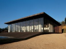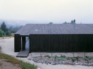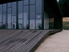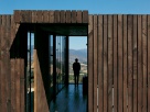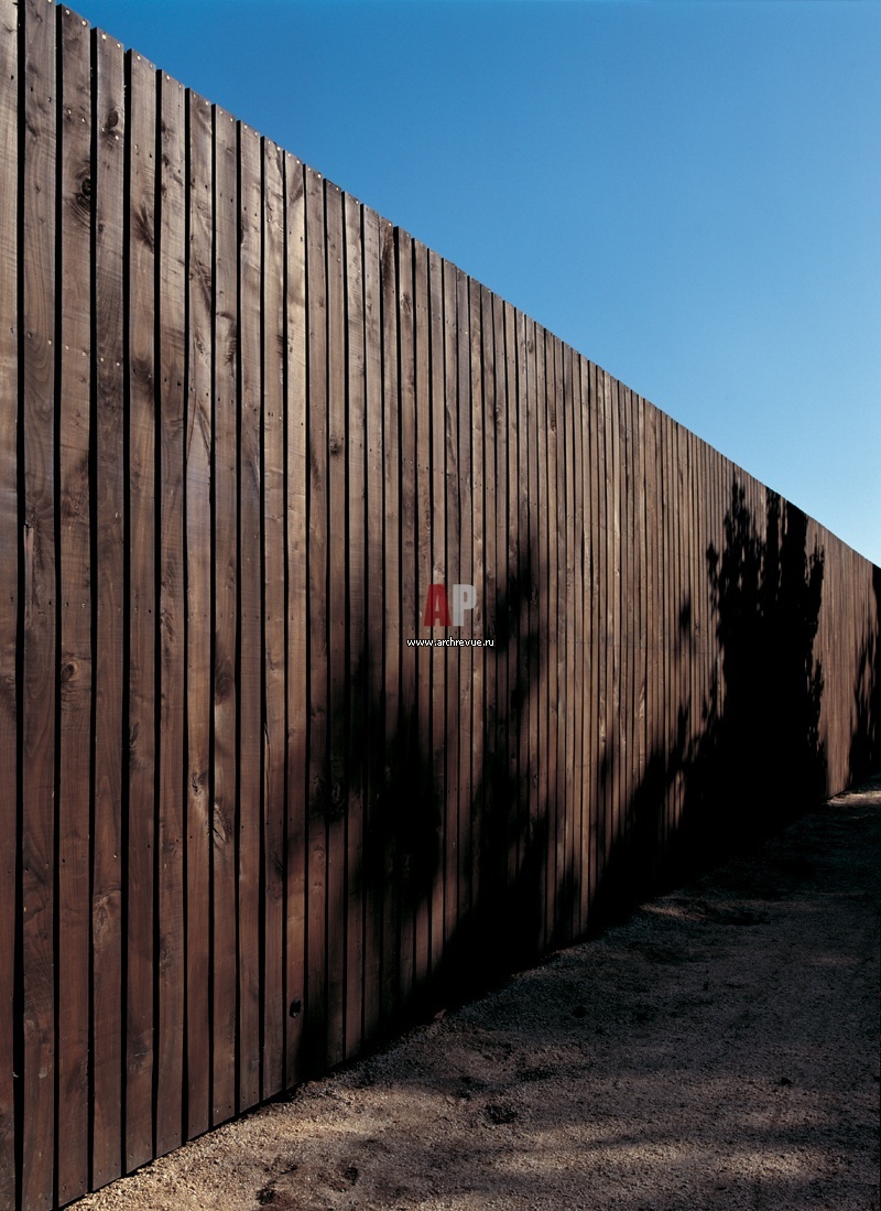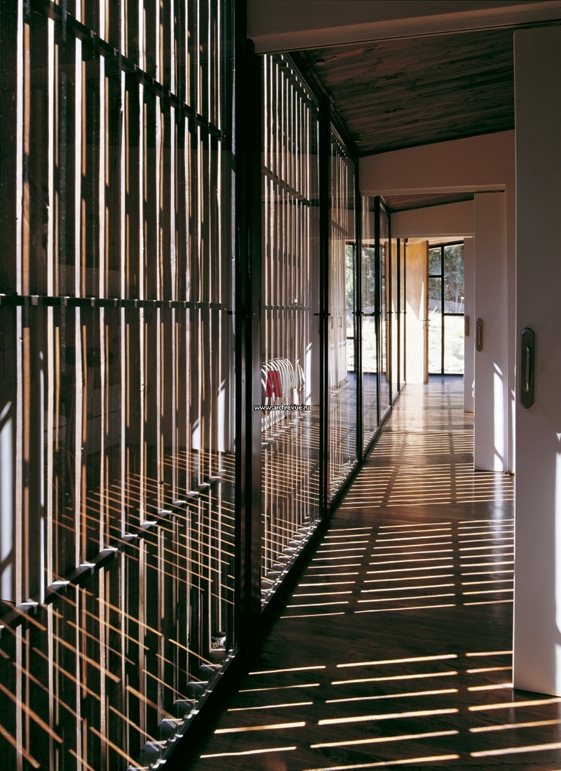 Но я бы развил дальше эту аналогию и сравнил бы этот дом с космическим кораблем. Строение находится на холме, горный пейзаж, бесспорно, красив, но он находится ниже уровня глаз. Главный действующий персонаж картины, которая предстает перед глазами при взгляде через окно, – это небо. Небо занимает почти весь оконный промежуток. Очень легко представить, как этот дом поднимается в воздух и улетает в бесконечное пространство. Фасад строения выполнен в легкой реечной манере, что делает здание невесомым и хрупким на вид.