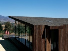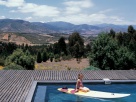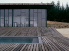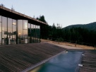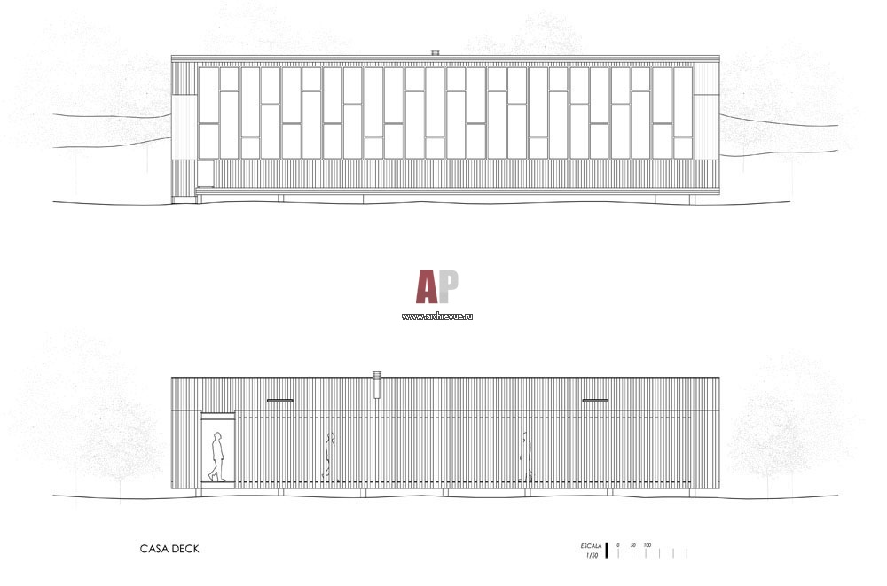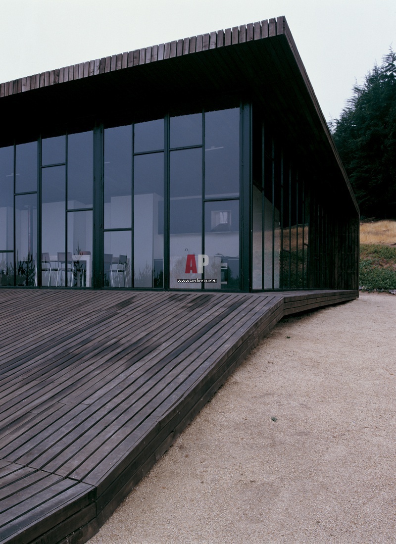 Авторы строения сравнивают свой проект с двухпалубным кораблем. Действительно, можно сказать, что верхняя палуба – это сам дом, а вторая, нижняя, палуба – это огромная деревянная терраса со встроенным бассейном. Плоская крыша и плоская терраса контрастируют с изломанными линиями окружающих гор. Сама постройка вместе с террасой похожа на большой деревянный шезлонг размером с дом, предназначенный для того, чтобы наслаждаться неповторимым пейзажем.
