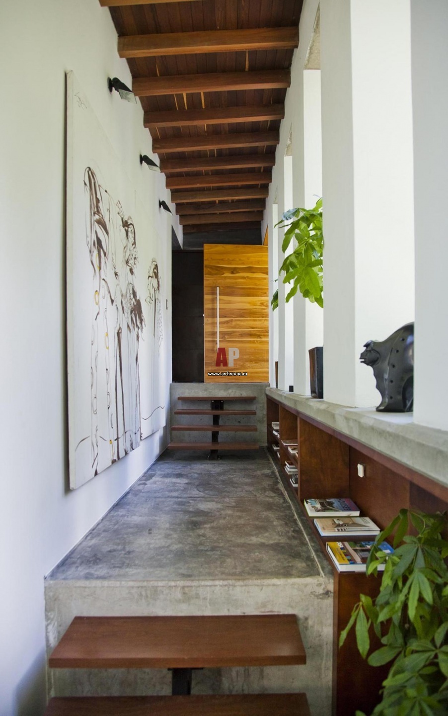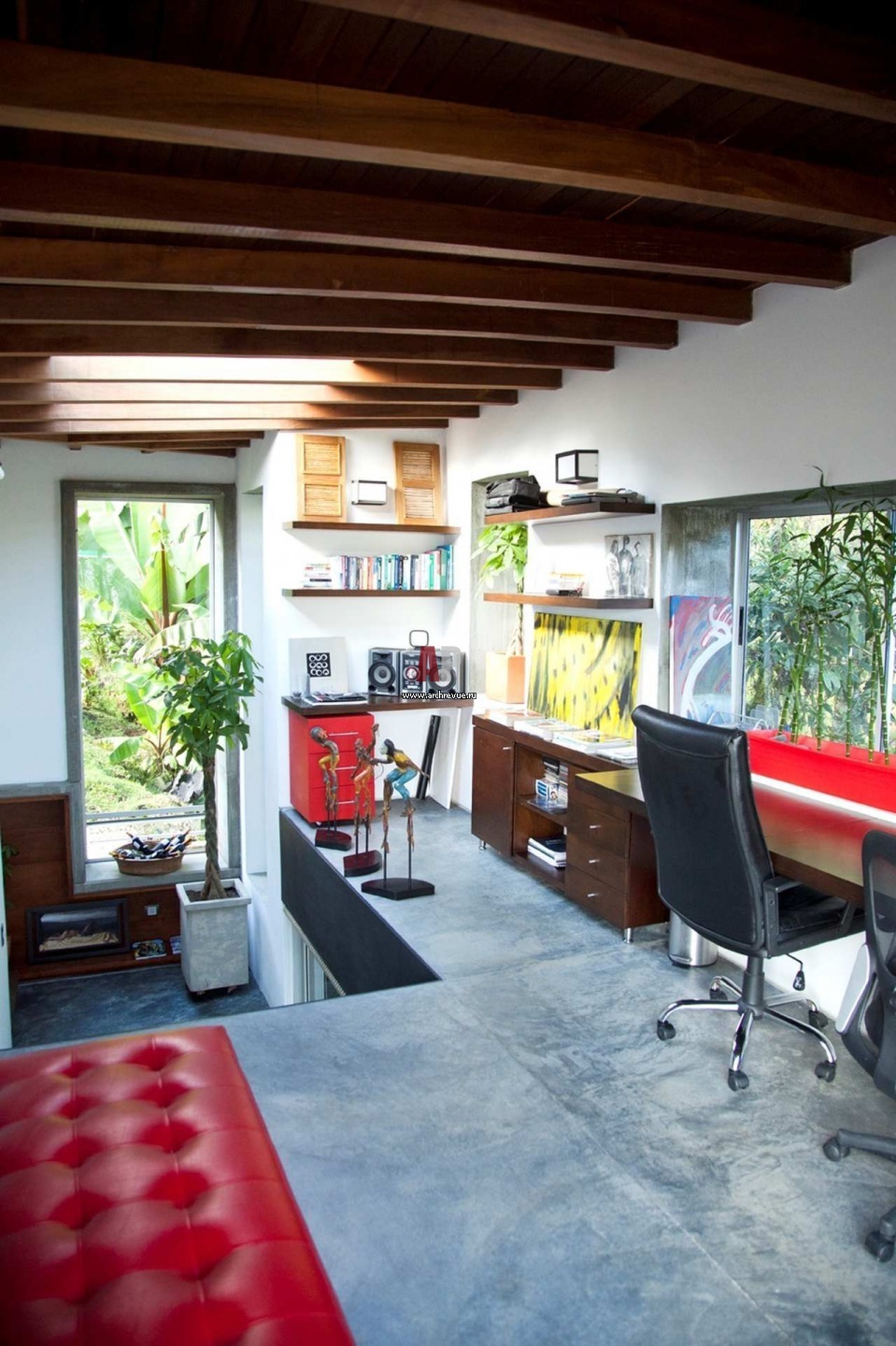 Вся постройка выполнена в стиле современного функционализма, что хорошо дополняет мебель в стиле лофт. Нет ничего лишнего, никаких декораций. Видимо, таким минимализмом архитектор хотел подчеркнуть живописность окружающей дом природы. Из всего вышесказанного можно сделать вывод, что дом несамодостаточен – он сконцентрирован на пейзаже. Благо, что в Колумбии нет зимы. На белом фоне такая заостренность на природе выглядела бы легкомысленной.