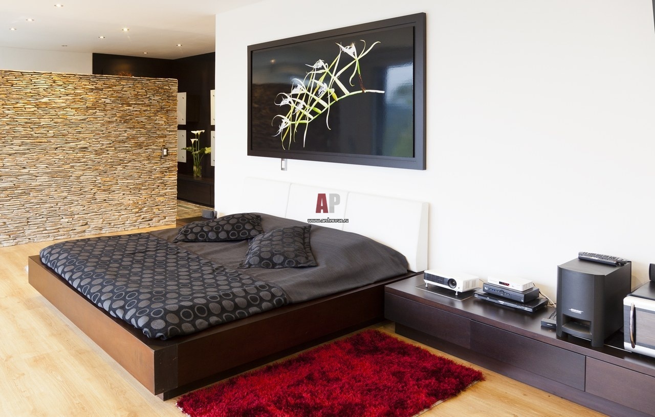 Второй этаж гораздо интереснее, хотя по размеру существенно меньше первого. По сути, это всего лишь одна большая комната с перегородкой, отделяющей спальную часть от санузла. Вместо стены – окно. Пейзаж в целом тот же, что и на первом этаже, но есть интересное отличие. Склон, на котором расположен дом, довольно крутой, поэтому второй этаж находится на уровне верхушек деревьев. Выйдя на небольшую террасу второго этажа, видишь прямо под собой простирающиеся деревья и горы. Значительную часть видимой природной картины занимает небо.