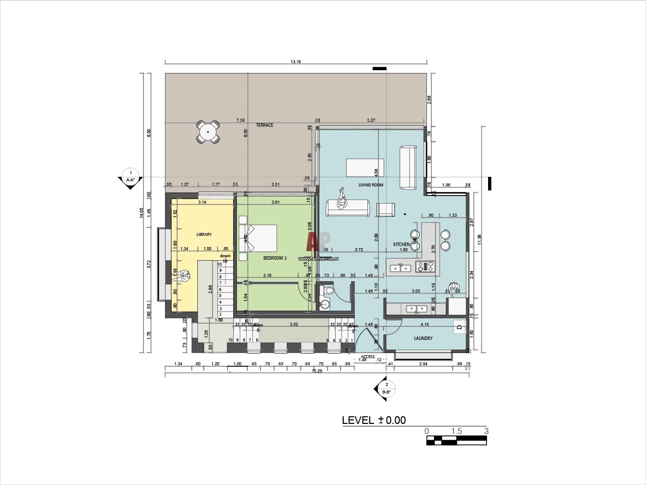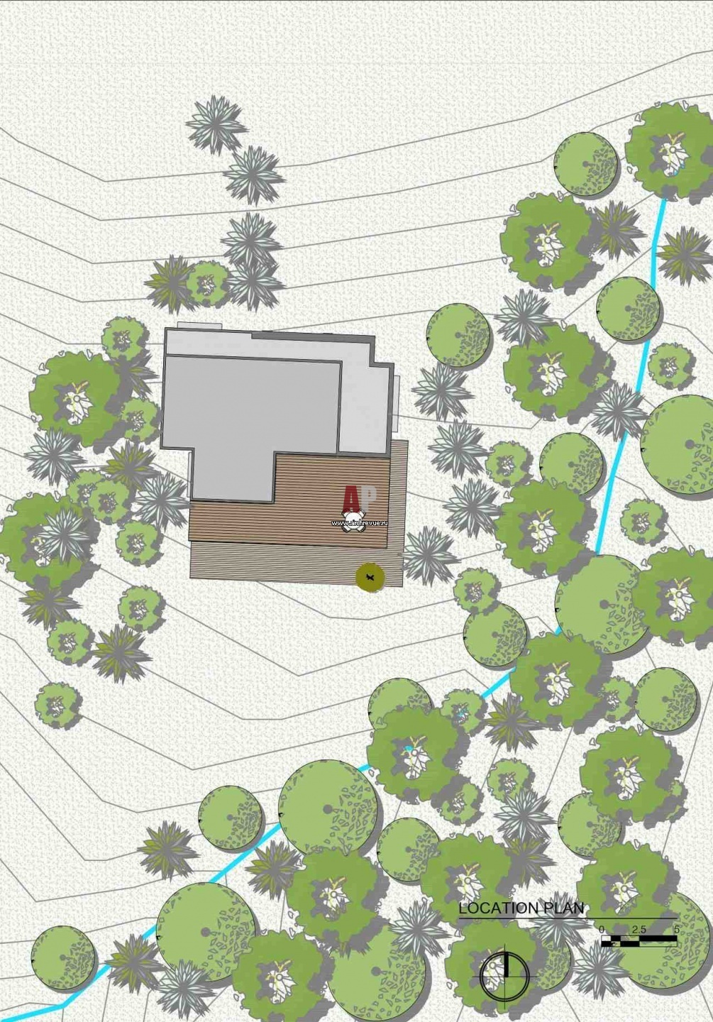 Дом относительно небольшой, в нем находятся две спальни, просторная гостиная, пара кабинетов и романтичные террасы. Главный вход расположен с задней стороны дома и проходит через верхний уровень. С этой стороны от автостоянки к дому ведет мраморная лестница, которая опоясывает все строение и выходит на нижнюю большую деревянную террасу.