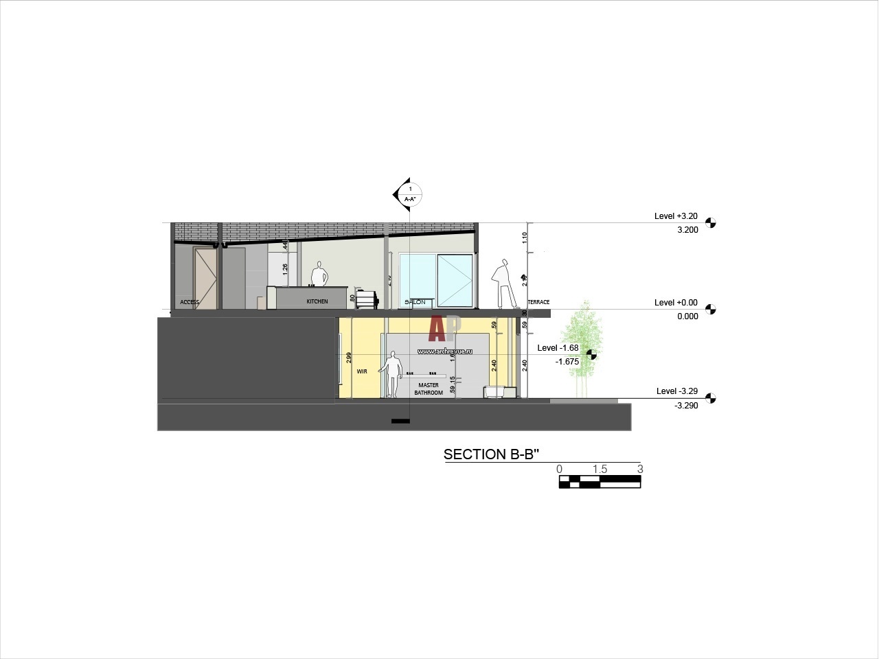 На первом этаже доминируют окна, занимающие почти всю стену. Все внимание этой комнаты сосредоточено на пейзаже за окном. Красивейшая горная панорама открывается с трех сторон. Боковые стены также имеют большие окна. Общая комната продолжается деревянной террасой, которая подходит к самому краю склона. Гостиная совмещена с кухней, поэтому помещение первого этажа представляет собой одну просторную комнату с небольшими функциональными перегородками. Этажи соединяет узкий и ничем не примечательный коридор. Интересно, что вспомогательные помещения дома не имеют самостоятельного значения. К этим помещениям можно отнести и кабинет, который из-за своего малого метража и какой-то структурной неосмысленности не представляет собой законченной комнаты.