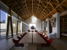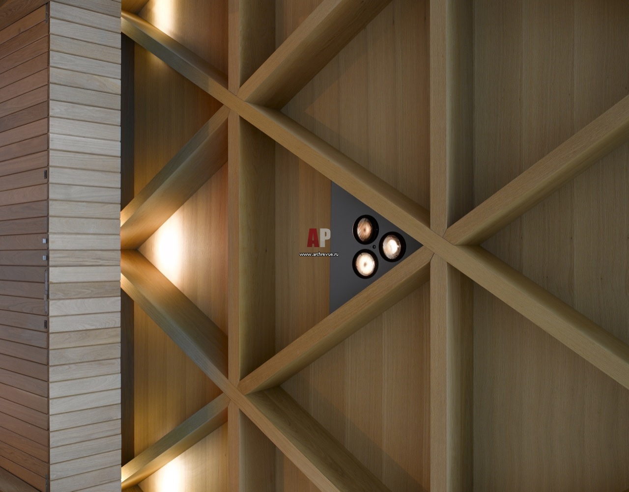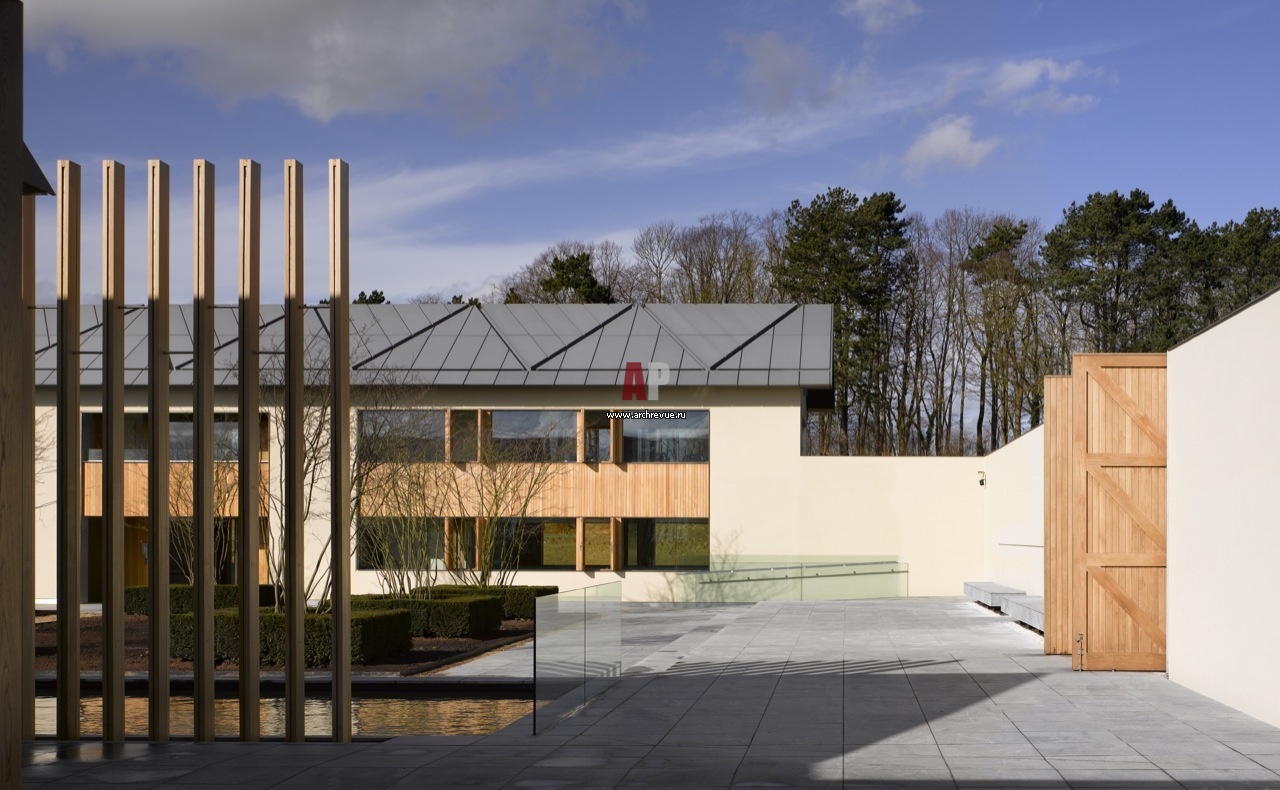 Кроме того, архитектор применил водный дизайн. Ничто так не разнообразит внутренний интерьер двора, как грамотно сформированный бассейн. Здесь мы видим два водоема, органично встроенных в плоскость двора. Бассейны выполняют абсолютно декоративную функцию. В сочетании с декоративным забором, стоящим вдоль воды, длинный и узкий водоем создает визуальный эффект расширяющегося пространства. Двор кажется очень широким и вместительным.