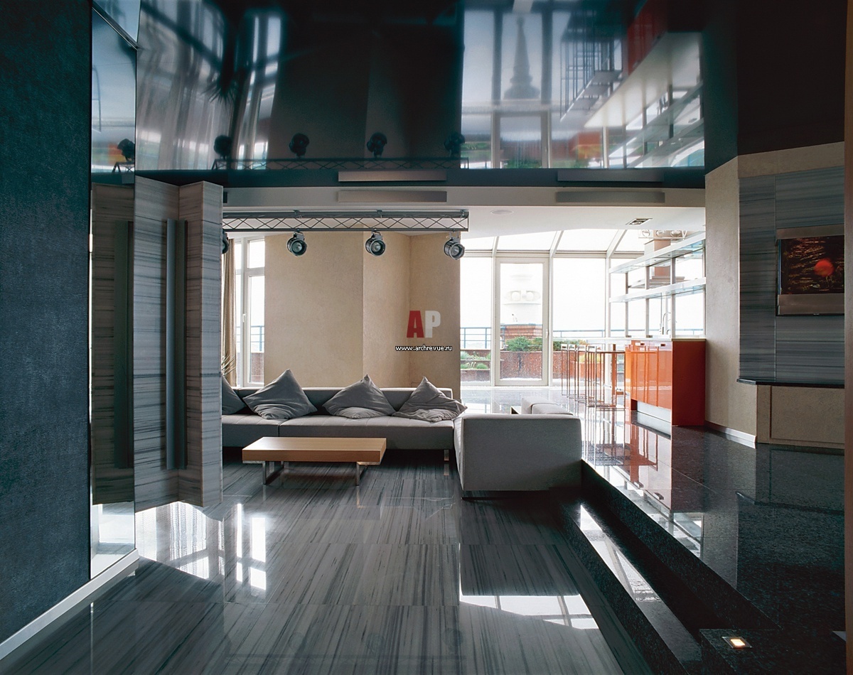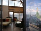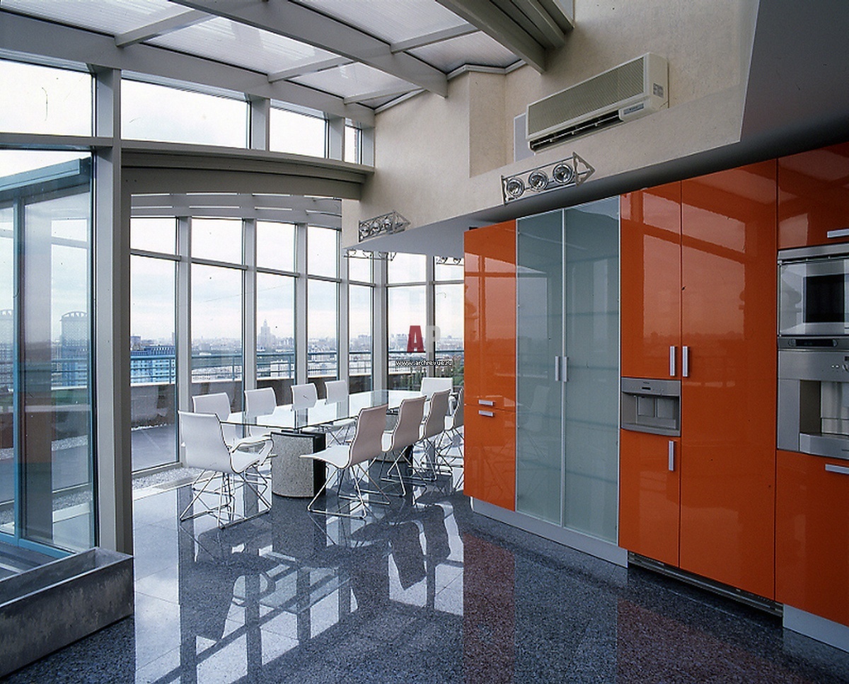 Двухуровневый пентхаус завершает павильон, построенный на крыше дома. Павильон поставлен на самом краю крыши, он опирается на несущие конструкции дома. Подробнее о проекте см здесь.