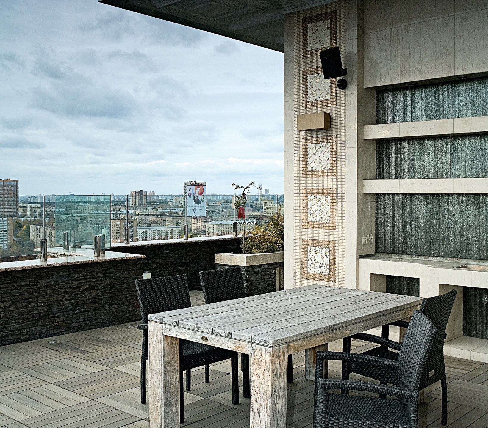 Заканчивая разговор о террасах с выходом на крышу, надо сказать, что традиция проектировать такие конструкции сформировалась еще во времена строительства «сталинских» высоток. Балконы на уступах крыш этих величественных строений по площади равны размерам квартир... Однако и относительно скромные по площади балконные пространства архитекторы великолепно используют для самых разных целей.