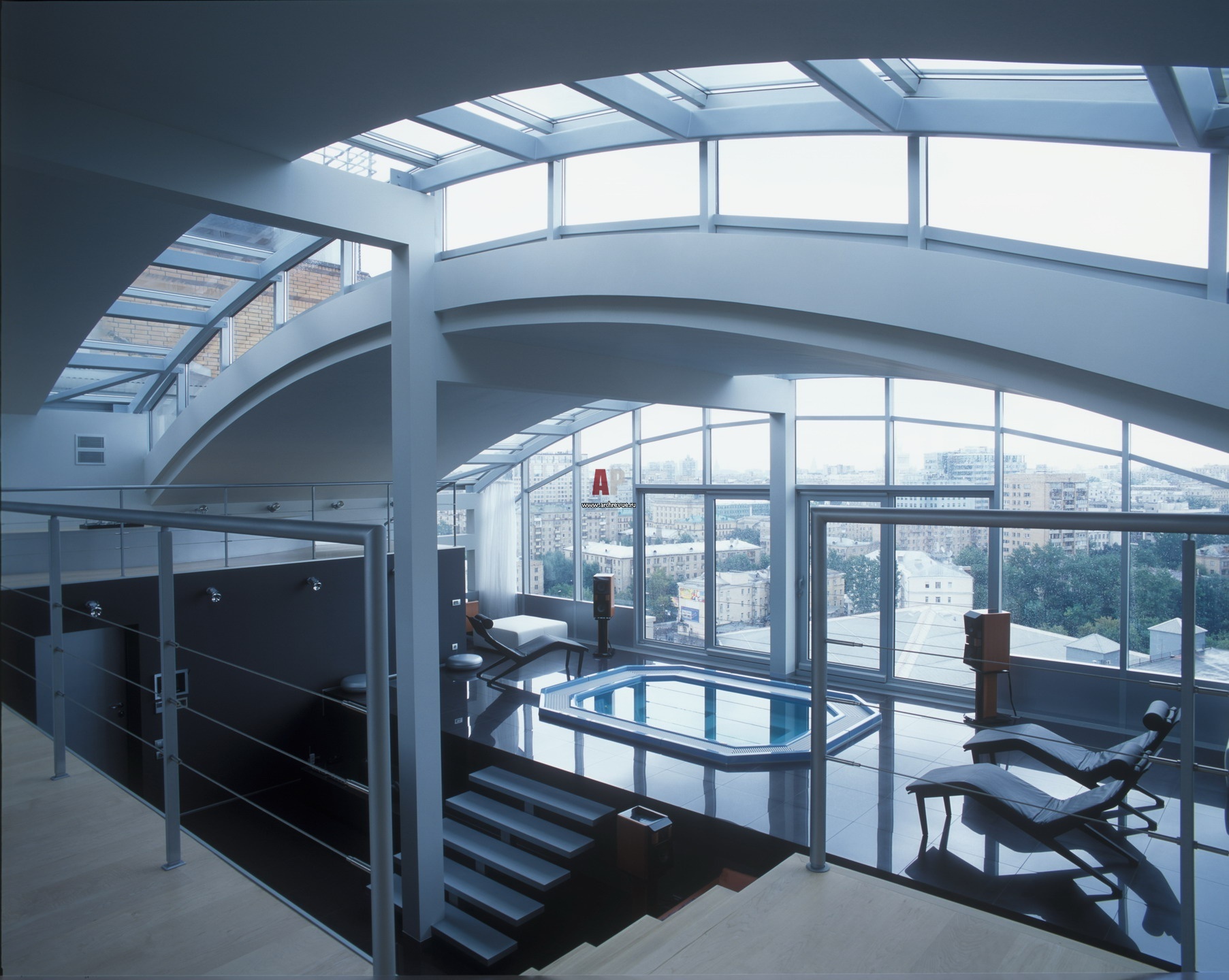 Все эти примеры относятся к использованию уже имеющихся террас на крышах. Но некоторые идут дальше. Архитекторы Юля Вишнепольская и Андрей Карцев возвели на крыше павильон, в котором расположили бассейн с великолепной зоной отдыха.