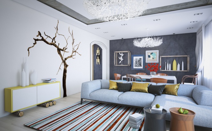 Просторная гостиная — главная комната в квартире, и формально, и концептуально. Идея того, как будет выглядеть это помещение, не пришла, а буквально прилетела — в клюве. Знаете, как это бывает: купишь шляпу, а поменяешь весь гардероб. Именно эффектный арт-объект с белыми птицами задал направление. Так появилась люстра с растительным орнаментом, неуловимо напоминающая гнездо, картина с перьями, фотообои с изображением дерева. Отчётливо проступили черты экодизайна.