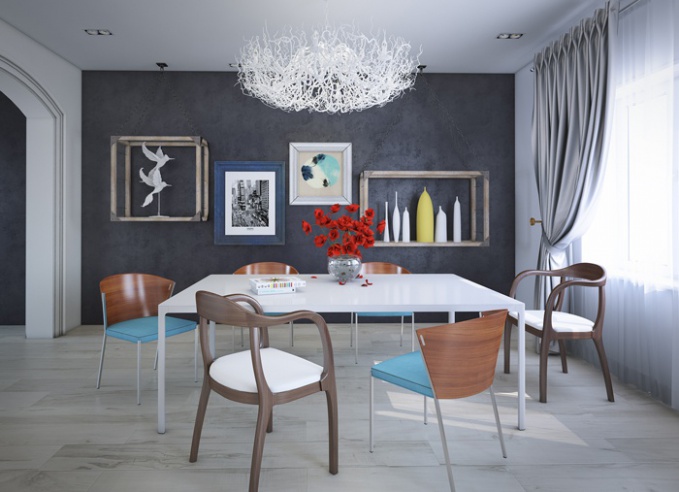 Столовая зона меньше всего похожа на пространство "при кухне". Элегантный декор и необычные стулья помогли создать обстановку, в которой хочется задержаться, чтобы как следует распробовать десерт.