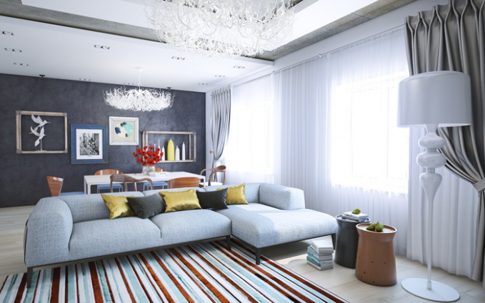 Серая полоса на потолке дополнительно зонирует гостиную и столовую. Однако это не единственная её функция: дело в том, что она визуально приспускает потолок, что добавляет пространству уюта.