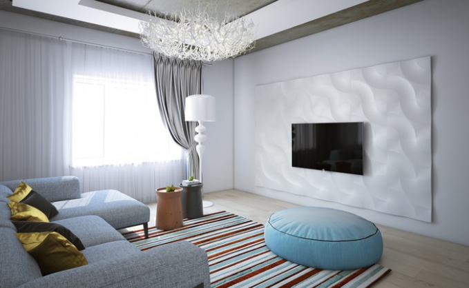 За телевизором размещена причудливая стеновая панель. Её "волны" оживляют стену и задают особый ритм.