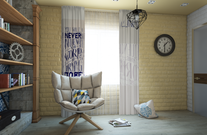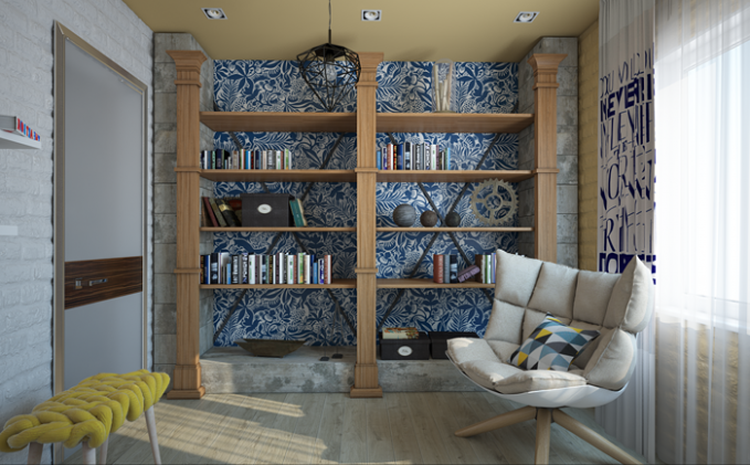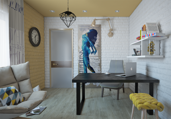 Кабинет — самое тёплое по цветовой гамме помещение в квартире. Идея стеллажа пришла из лофта и, вписанная в размеры рабочего кабинета, она ничуть не утратила своего шарма. Кабинет получился креативный. Это подчёркивают разноцветные стены, асимметричная люстра, текстиль. Особое внимание уделено свету.