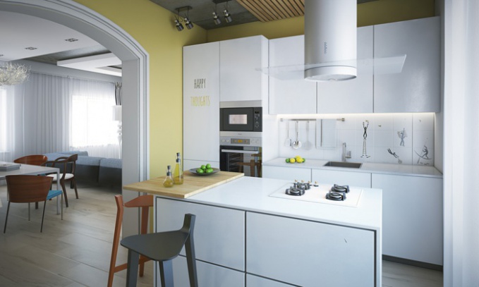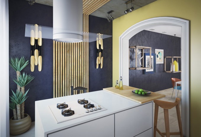 Кухня маленькая и функциональная. В ней есть всё, что нужно, и скрыто всё, что нужно скрыть. За имитацией бетона на потолке ловко скрыты все коммуникации. В плане цветовой гаммы кухня продолжает гостиную. На фартуке — плитка Bardelli.