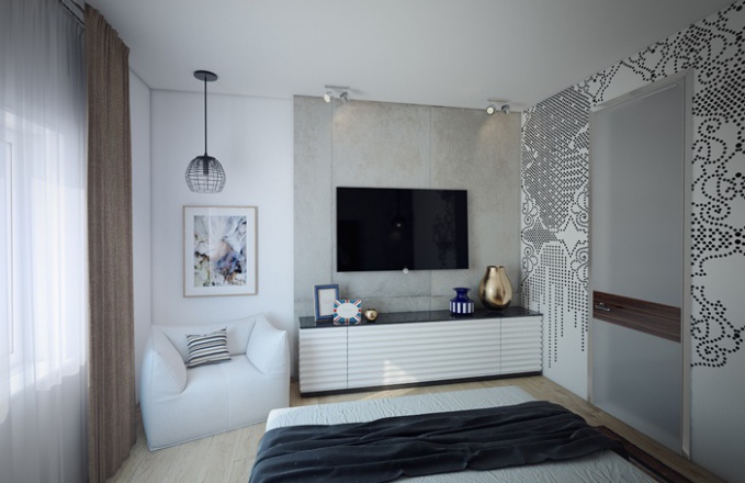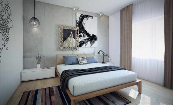 В спальне тоже находим отголоски дизайна гостиной: на стене — итальянские фотообои из той же коллекции. Самый модный ход здесь — это, конечно, бетонные панели за кроватью и телевизором. К ним хочется прикасаться. Над кроватью висят две абсолютно полярные картины. Казалось бы, им совершенно нечего делать в такой неприличной близости, но и в магнитах, как известно, притягиваются лишь разнозаряженные стороны. У тех, кто будет здесь спать, очень разные характеры, и всё же они так нежно любят друг друга.
