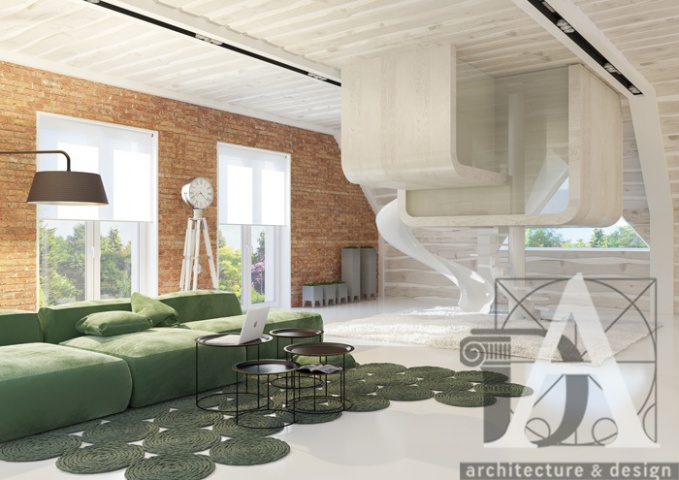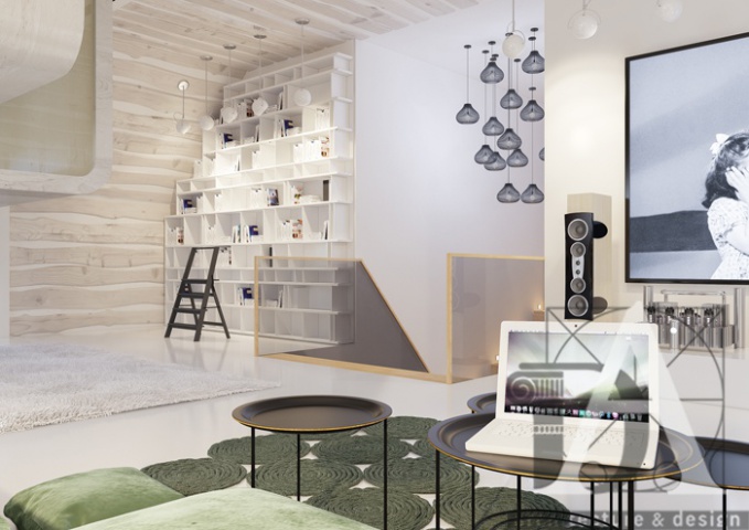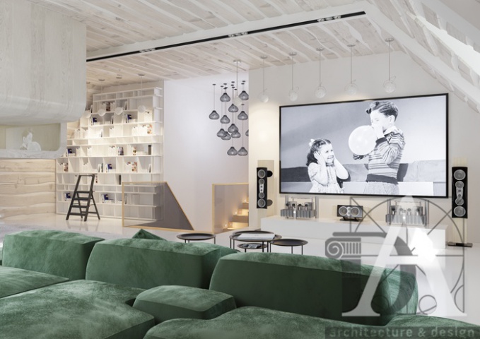 Эта комната просто предназначена для семейного отдыха, в ней каждый найдет себе занятие по душе. Комната объединяет в себе и игровой комплекс для детей, и кинотеатр, и библиотеку, а огромный зеленый диван точно никого не оставит равнодушным!