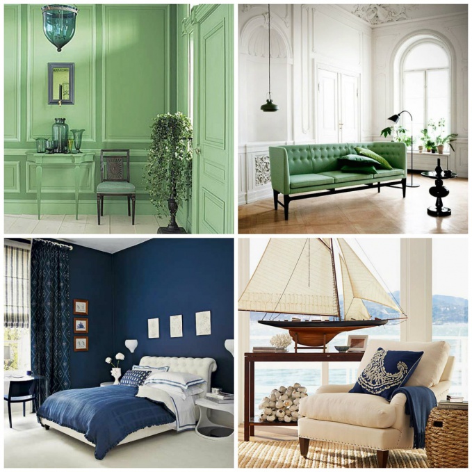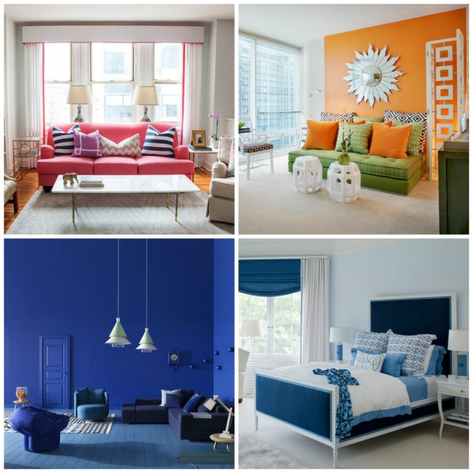 В-пятых, цветовые сочетания. Фактически, это тема отдельной статьи. Но если коротко, то необходимо определить, как отдельные цвета влияют друг на друга — усиливают или оттеняют друг друга. Так, неудачно выбранный цвет дивана можно смягчить аналоговым, но более приятным вам цветом декоративных подушек; а если цветовое сочетание (например, сине-белое) показалось неудачным, выберете доминирующий цвет , более приятный вам (например, белый), и добавьте его в аксессуары и текстиль (шторы, подушки, картины).