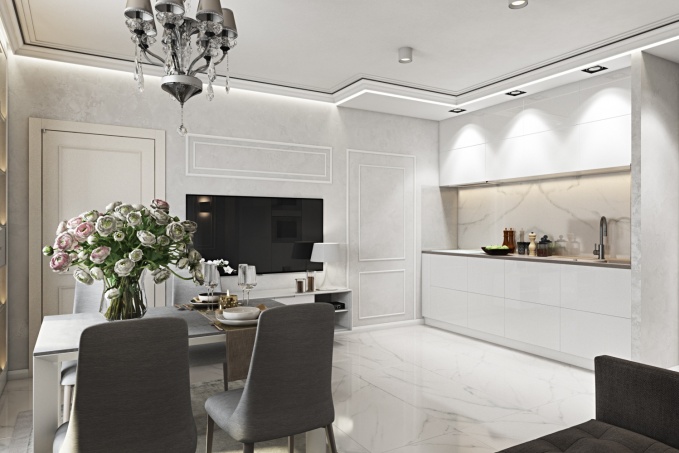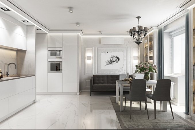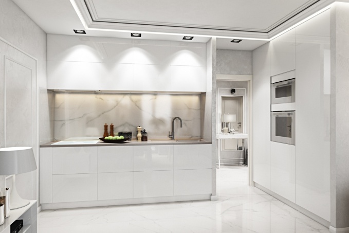 Кухонную зону было решено расположить по двум стенам от входа в помещении, тем самым, освободив общее пространство для гостиной и столовой зоны.