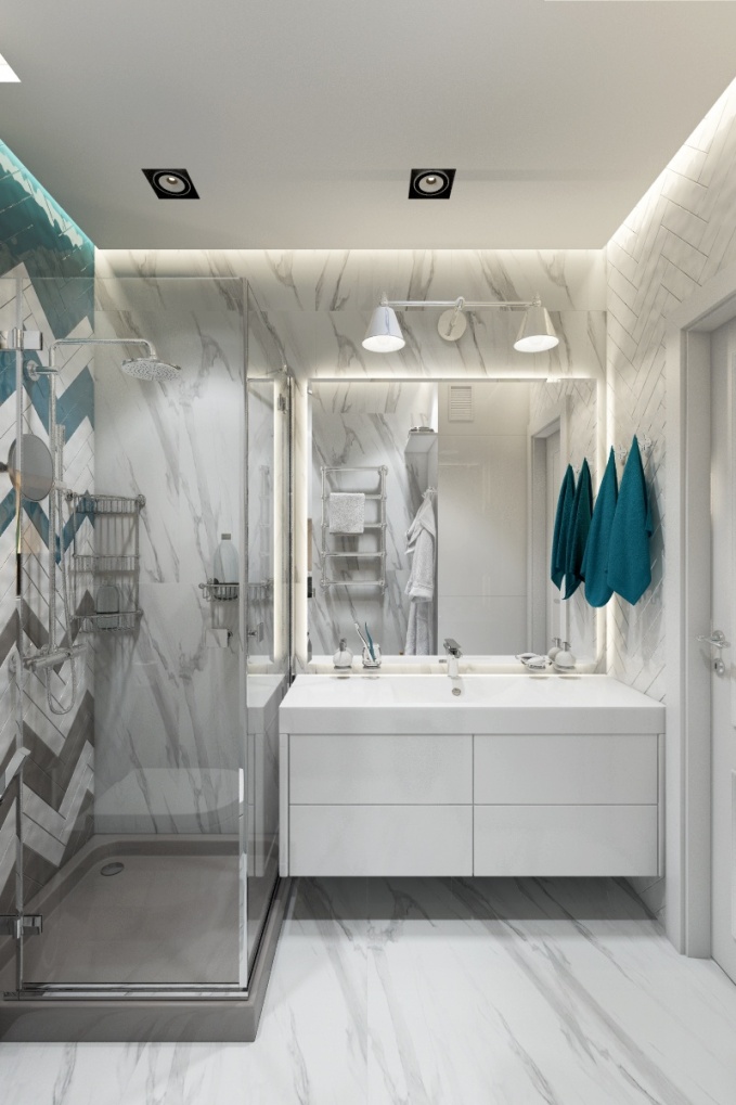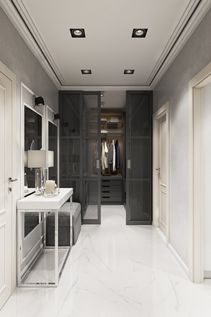 На стене напротив входа предусмотрены встроеные витрины со стеклянными дверцами, подсветкой и зеркальным корпусом изнутри, что создаёт ощущение увеличенного объёма.