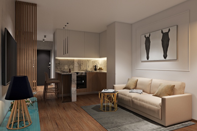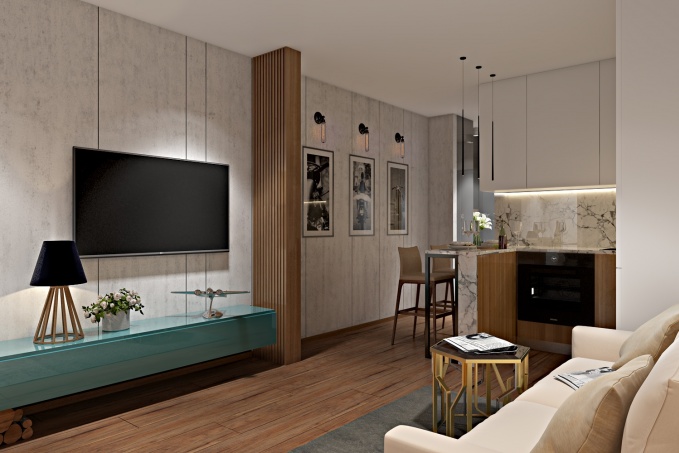 Мы разработали проект квартиры-студии для молодой семейной пары летом 2017 года. Семья ведет активный образ жизни, много путешествует и любит принимать гостей, все эти моменты необходимо было учесть в будущем интерьере. Легкий фьюжн лофта и модерна - именно то, чего желали наши заказчики. Цветовое решение также минималистично – однородный характер без активных акцентов.