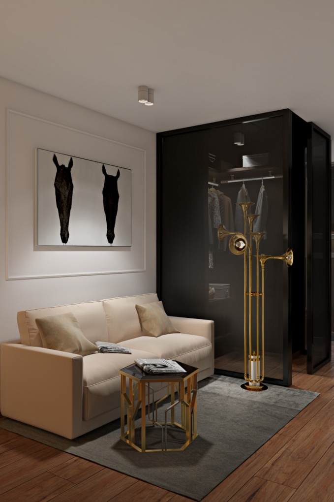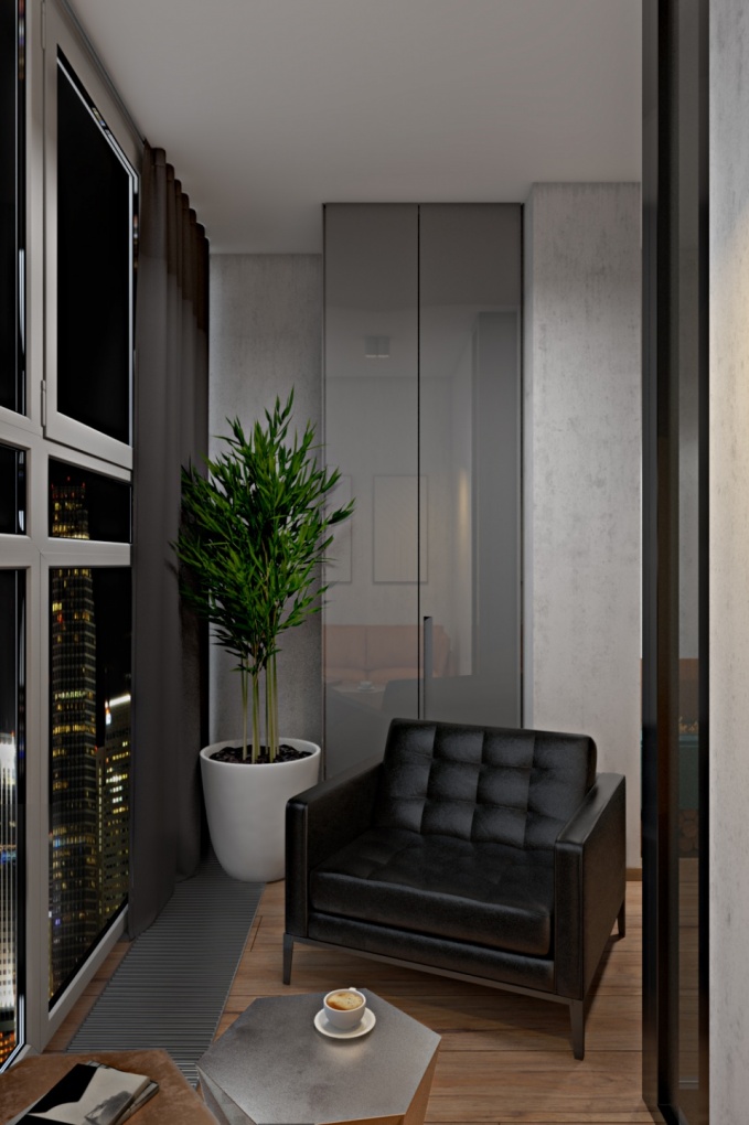 Главной сложностью было создание удобного и визуально разделённого пространства. При том, что квартира представляет собой очень сильно вытянутый прямоугольник с единственным окном во всю стену, и исключено возведение каких-либо перегородок, дабы не препятствовать солнечному свету. Решено было выделить 3 "куба" - кухня, гостиная и гардероб, плавно переходящий в лаунж зону на лоджии и обозначить их некими вертикалями. Они и помогают глазу поделить это пространство на зоны и воспринять их, как разные.