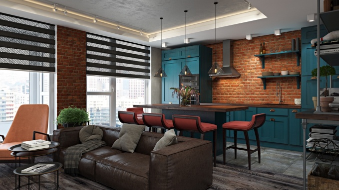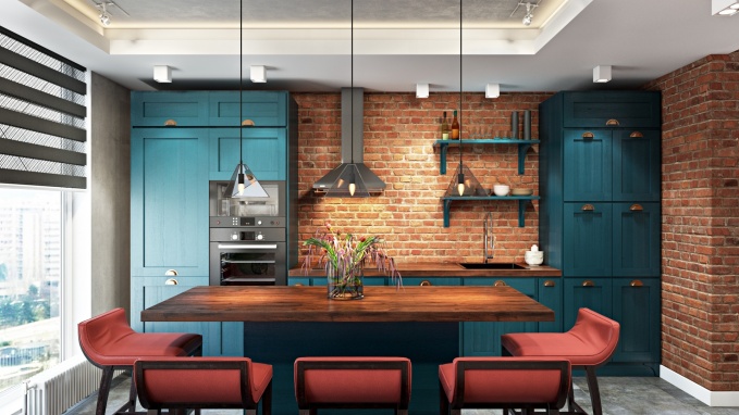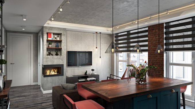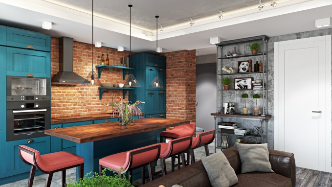 Яркости нашему лофту прибавляет не только красный кирпич и крашенная мебель, но и разные сценарии освещения. По этому на нас работает и цвет, и свет.