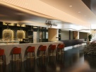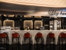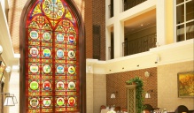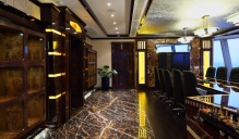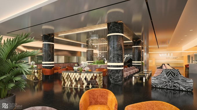 Задача - создать уютную атмосферу, изменив центральную часть холла отеля, расположенную между четырех колонн, не затрагивая отделку по периметру, интегрировать в существующую планировку лобби-бар. Плавные линии нового логотипа отеля подсказали идею создания волнообразного акцентного узора с легким восточным характером. Для придания холлу уюта были выбраны золотистые, охровые, терракотовые тона. Колонны сделали выразительнее с помощью мраморной отделки из Verde Rameggiato со вставками из оникса Onice Nuvolato Extra с интегрированной подсветкой. Логотип также из оникса с подсветкой. Чешуйчатый рисунок консолей поддерживает сочетания плавных линий и создает легкий экзотический эффект.