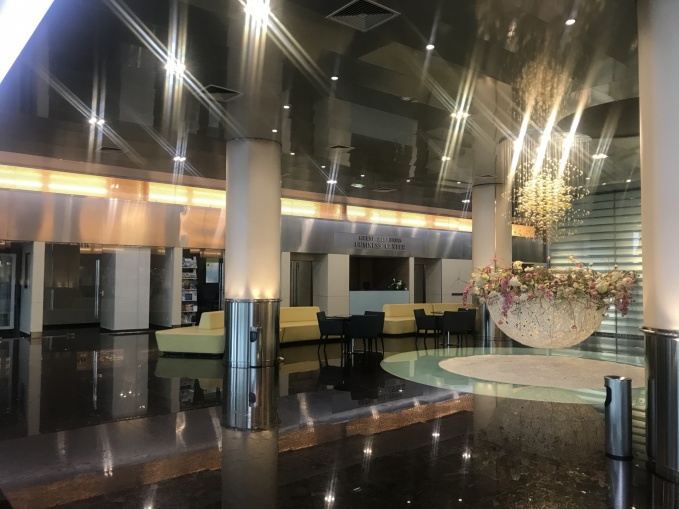 Первоначальный интерьер холла отеля - большой, неуютный, с преобладанием серых, черных оттенков и металла.
