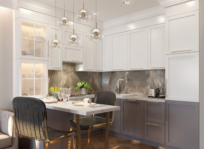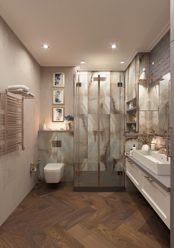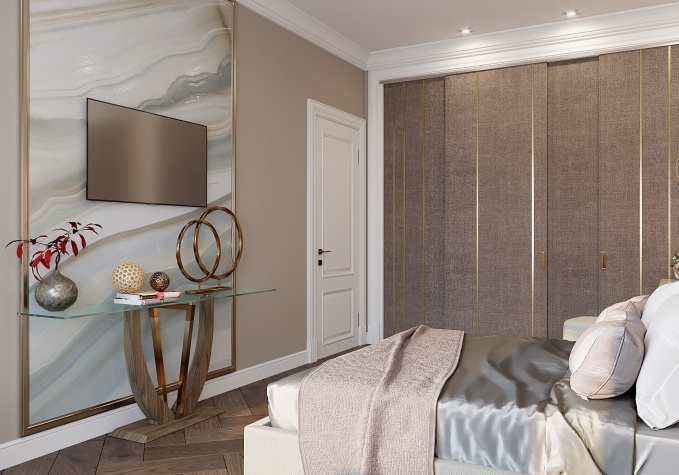 Так у квартиры появляется характер. Выверенные и тонкие формы, сочетание дерева и камня придаёт индивидуальность и легкость, а металл сохраняет его в балансе. Отблески латуни, массив ореха и натуральный камень создают благородный и уютный интерьер.