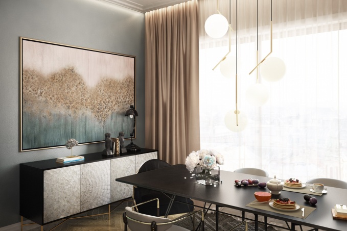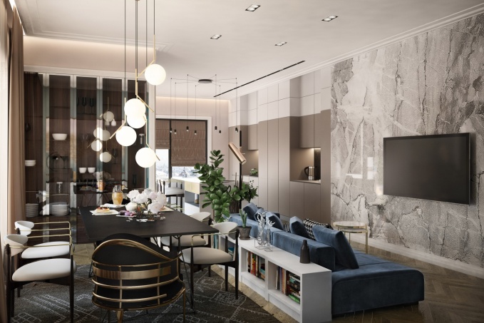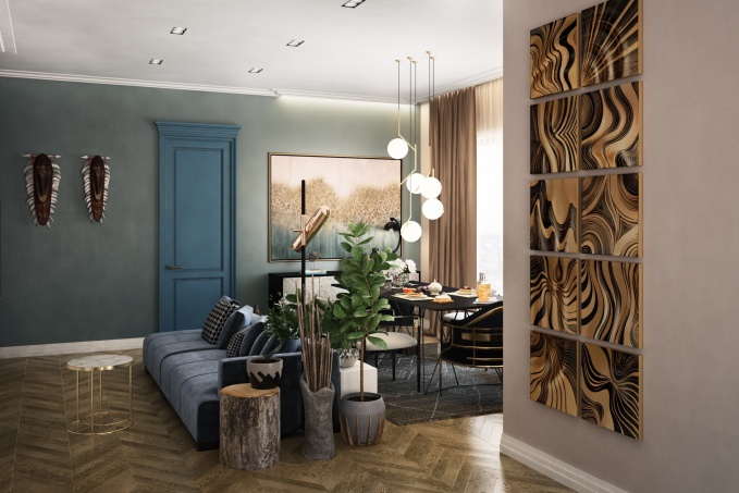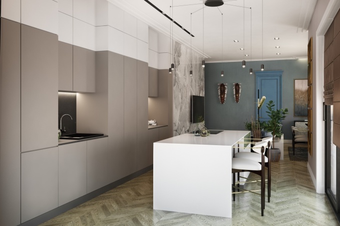 В отделке и мебели было отдано предпочтение натуральным материалам, сочетание которых мы также изначально сделали эклектичным. Так, например, классический дубовый паркет "елочкой" прекрасно ужился, на наш взгляд, с технологичной кухней без лишних деталей.