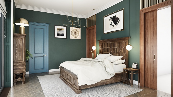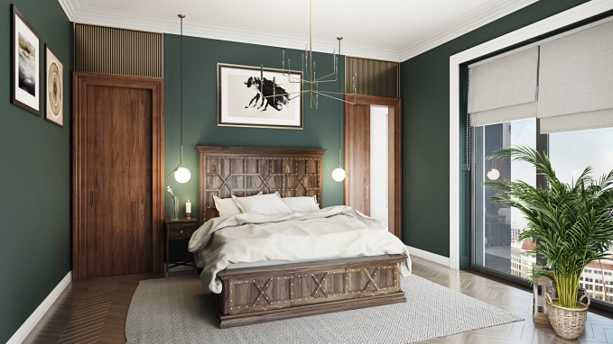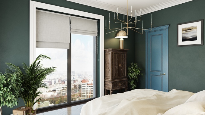 Мы решили создать комнату, которая объединила гостиную, кухню и полноценную столовую. В приватной части хозяев спланировали небольшую спальню, где разместили только функционально необходимые предметы мебели, а также просторный санузел с видовым французским окном и ванной напротив. Гардеробную выделили в самостоятельную комнату, вход в которую расположен в спальне.