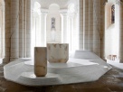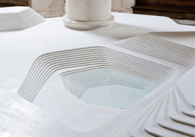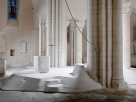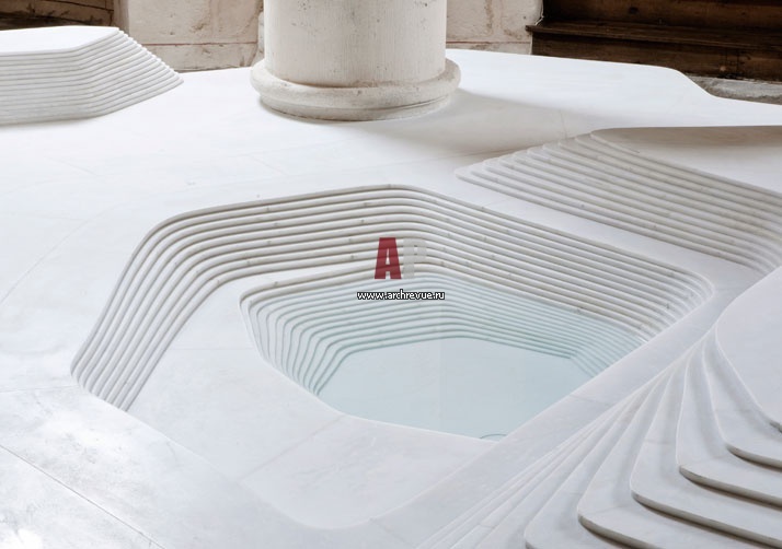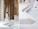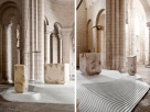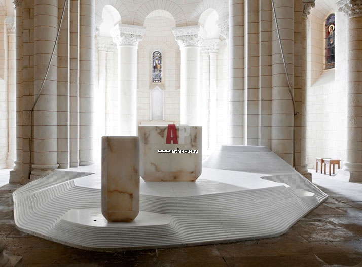 Для создания столь значимого элемента он использует стилизованную топологию местности, на которой размещается церковь. Восхитительные материалы – тоже присутствуют неспроста – белый мрамор и теллурические камни несут в себе особую энергию и стирают временные границы между основным зданием романского периода и новым алтарём. Система подиумов для церковного хора с исполинами-камнями выглядит необычайно органично в средневековой постройке.