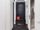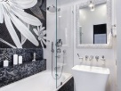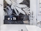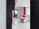Ванная с санузлом не воспринимаются как второстепенные, «технические» помещения благодаря контрастности и необычной отделке. Мы выбрали черно-белое решение в духе «инь-янь», когда пространство разделено на две половины «парящей» над полом черной подвесной тумбой с подсветкой. Центральная часть композиции – панно от Sicis на фоне мозаичной отделки Evolution от Architeza и керамической плитки Brilliant от Atlas Concorde. Все построено на черно-белых контрастах, однако, если открыть подвесную тумбу, ожидает внезапный сюрприз – все тот же насыщенный красный цвет. Это как финальный аккорд в интерьере, где нет ни одного лишнего декоративного элемента.