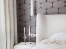 Спальня родителей – единственное пространство, где нет ярких акцентов, а преобладает изящество и элегантность различных светлых оттенков. Основную красоту создают тщательно подобранные бельгийские обои Arte от Noctis - с уникальной технологией нанесения рисунка лазером по ткани и эффектом мерцающей поверхности за счет тончайших серебряных нитей. Все оттенки белого – цвет облаков, создающий ощущение невесомости и счастья, прекрасно подходящий для спальни любящих людей. Мебель в спальне - кровать и тумбы Марсель от Estetica – дополнена люстрой Ise rain от IDL, Палантир свет.