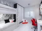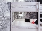 В детской основной интерьерный акцент - белые шведские обои SHADESART от MR PERSWALL, с необычным рисунком волнистых переплетающихся линий. Это продолжение фантастического мира сказочных растений на панно в гостиной и особая умиротворяющая атмосфера мечты. Люстра от Elvan также выглядит как необычный цветок, в точности повторяя изгибы линий на обоях. Двухъярусная кровать изготовлена на заказ по нашему эскизу и обита белой кожей, прошитой серебряными нитями. Нотки серебра на белом, часто повторяющиеся в интерьере, придают данному цвету оттенок чистоты и холодного изящества. Большой шкаф-стеллаж для детских вещей и книг во всю стену также сделан на заказ в Mr Doors.