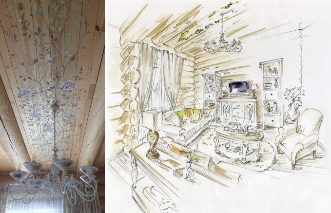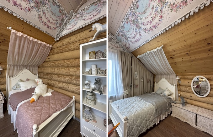 - Работа с высотой: В детской — использование декоративного фриза с росписью для визуального снижения чрезмерно высокого ската потолка.
