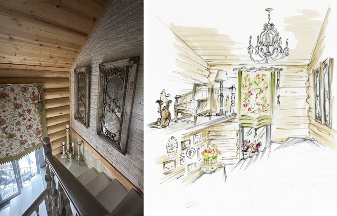 - Визуальное увеличение окна в лестничном холле: декор верхней части тканью с цветочным принтом, имитирующей гобелен.