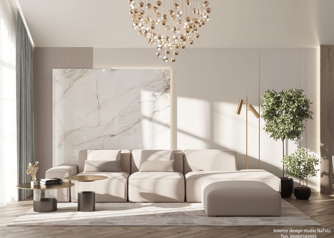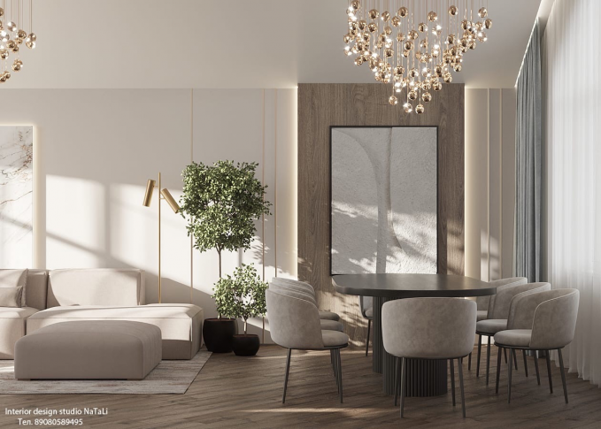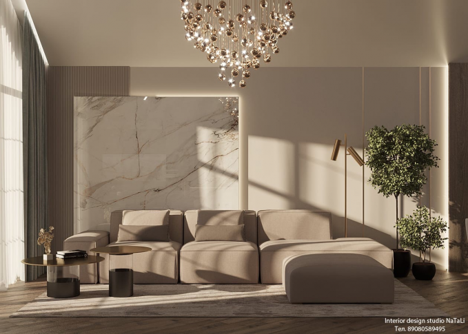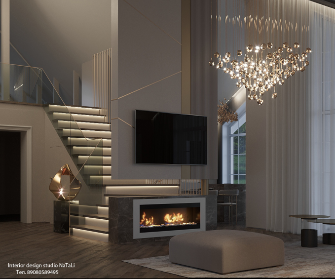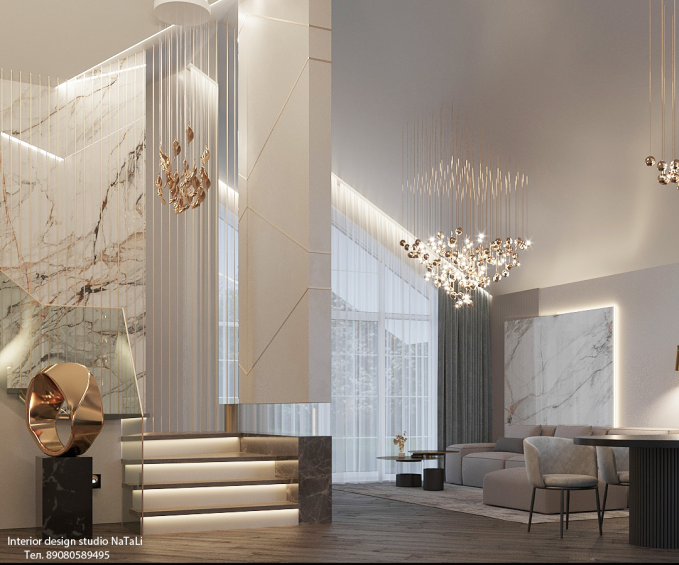 Современный интерьер дома с ноткой роскоши в деталях. Роскошные люстры, изготовлены под заказ. В интерьере прослеживается легкое матовое золочение. На стенах и на полу применены современные, экологически чистые материалы.