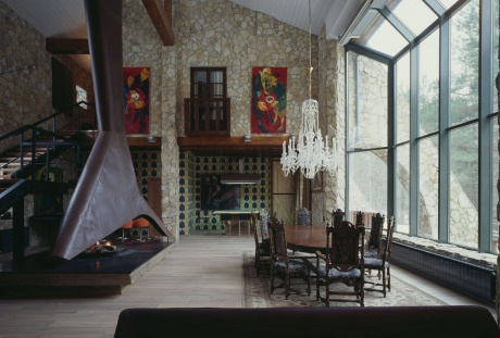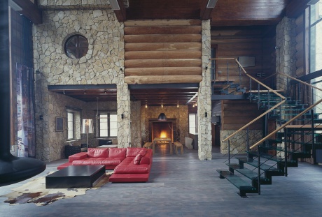 • сочетание известняка, 450-миллиметровых бревен и панорамного остекления